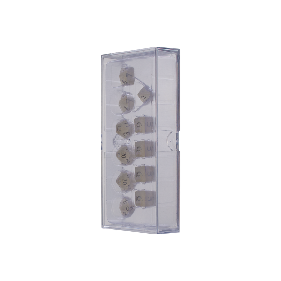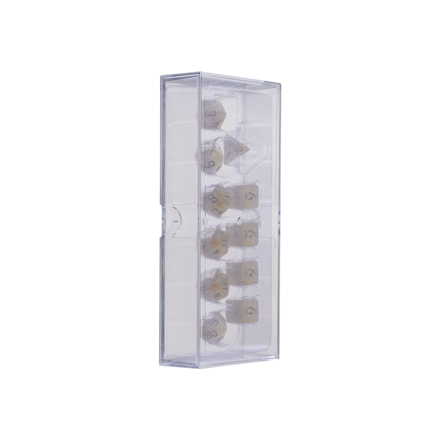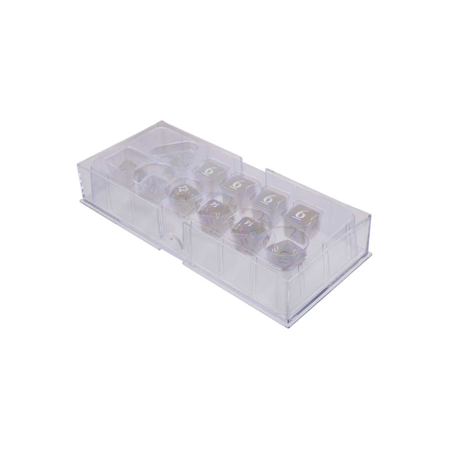 • 11 shimmering acrylic dice in a 2-piece storage box
