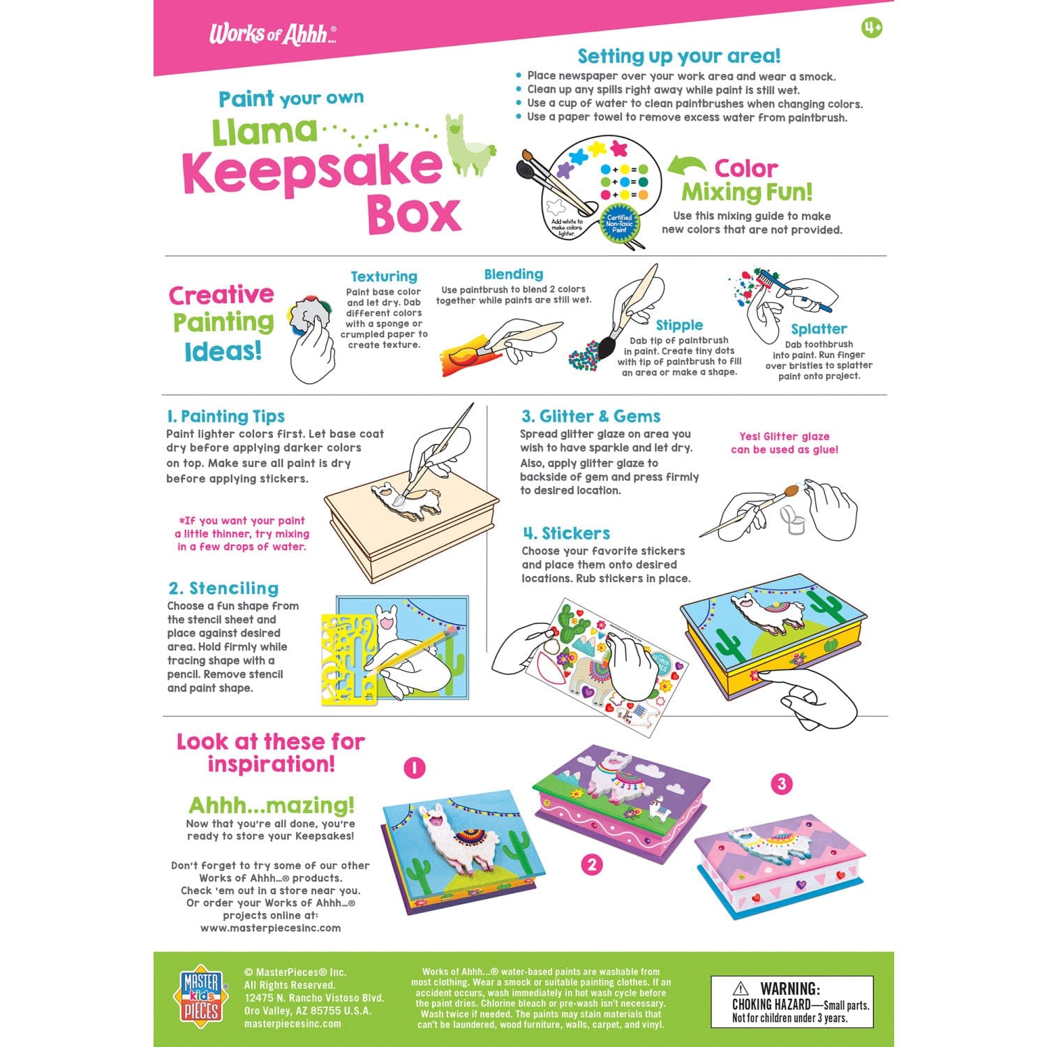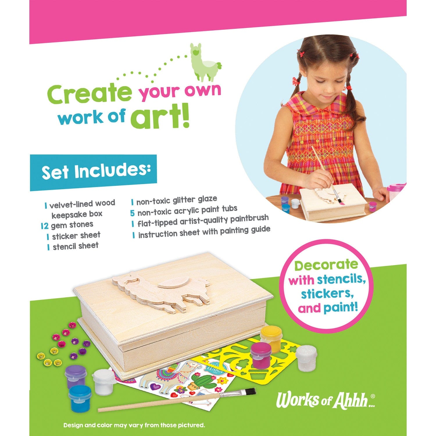 This Llama Keepsake Box Wood Craft & Paint Kit is made of real wood, and includes everything you need to create a beautiful work of art! The Llama Keepsake Box Wood Craft & Paint Kit is the perfect gift for every art loving kid! It includes 1 velvet-lined wood keepsake box, 12 gem stones, 1 sticker sheet, 1 stencil sheet, 1 non-toxic glitter glaze, 5 non-toxic acrylic paint tubs, 1 flat-tipped artist-quality paintbrush, and 1 instruction sheet with painting guide.