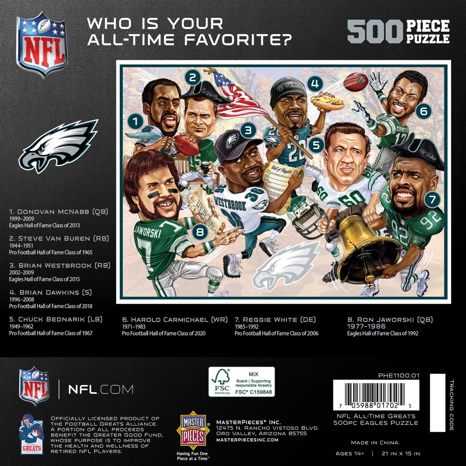 This MasterPieces 500pc NFL puzzle measures 15” x 21” and features some of the greatest NFL players to ever wear a Philadelphia Eagles uniform. The easily recognizable and fun caricatures are shown in a setting specific to the team name, city or history. To reduce its impact on our environment, the chipboard used in this puzzle is made of 100% recycled material.