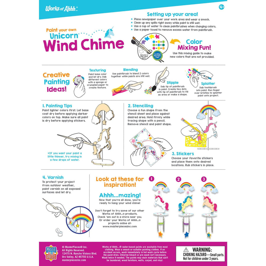 This Unicorn Wind Chime Wood Craft & Paint Kit is made of real wood, and includes everything you need to create a beautiful work of art! The Unicorn Wind Chime Wood Craft & Paint Kit is the perfect gift for every art loving kid! It includes 1 wood unicorn wind chime, 1 stencil sheet, 1 sticker sheet, 1 non-toxic outdoor varnish, 5 non-toxic acrylic paint tubs, 2 artist-quality paintbrushes, and 1 instruction sheet with painting guide.