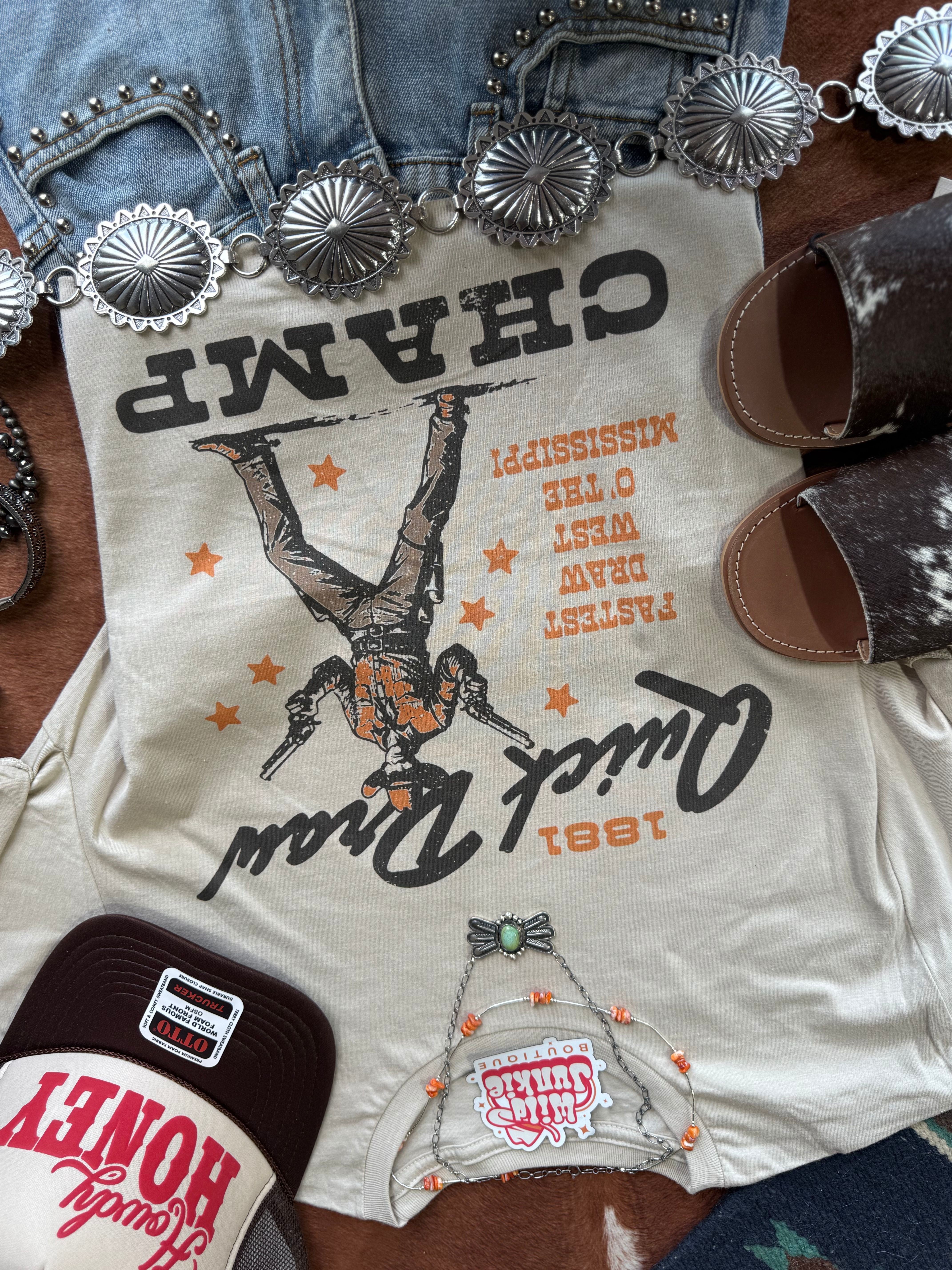 Channel your inner gunslinger with the Quick Draw Champ Graphic Tee. Printed on a soft cotton tee, this design features a cowboy poised mid-duel, flanked by retro-styled lettering— a shoutout to dusty saloons and high-stakes showdowns. It’s the perfect blend of frontier grit and casual comfort.