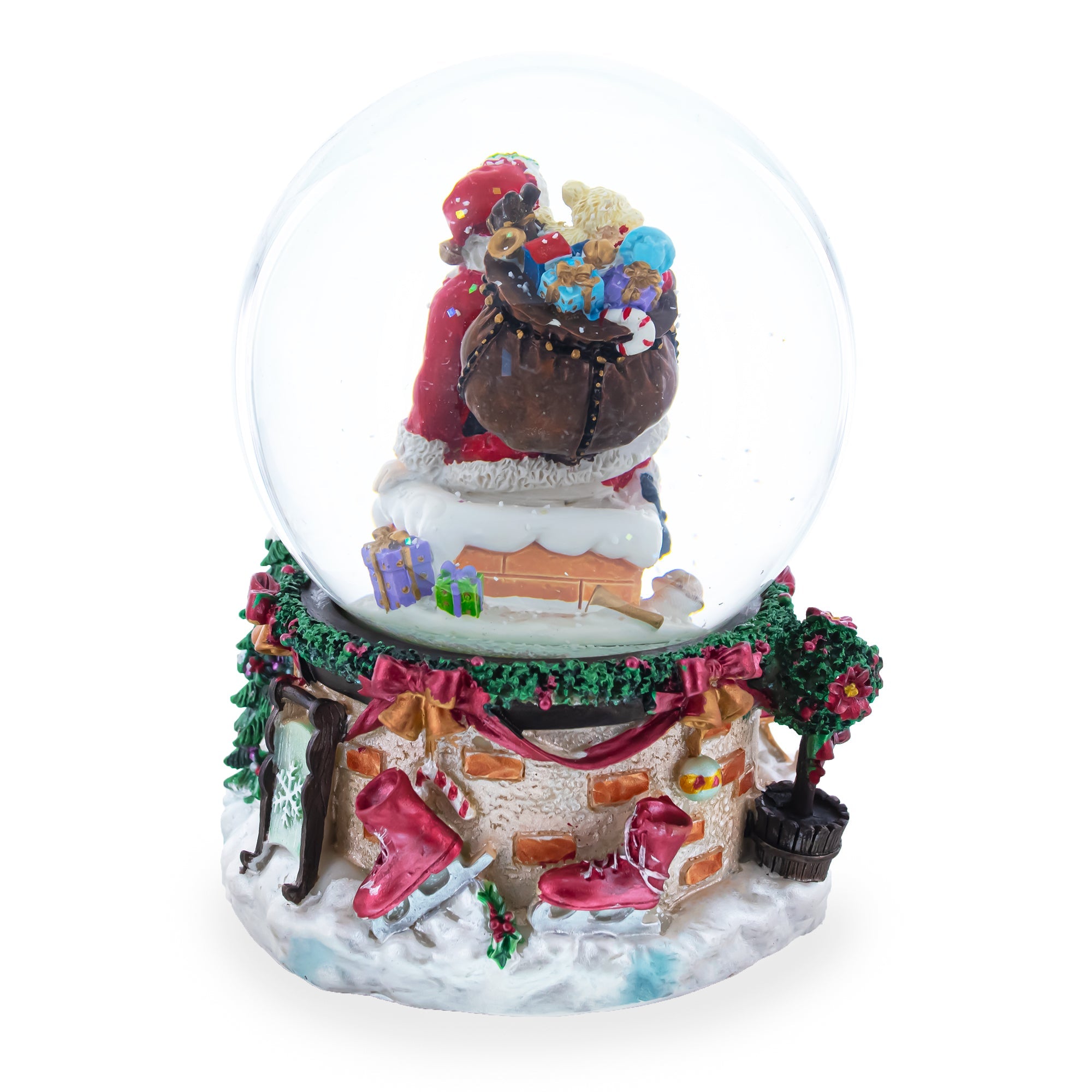 This charming hand-painted snow globe has Cheerful Santa on the house roof with the bag full of gifts.