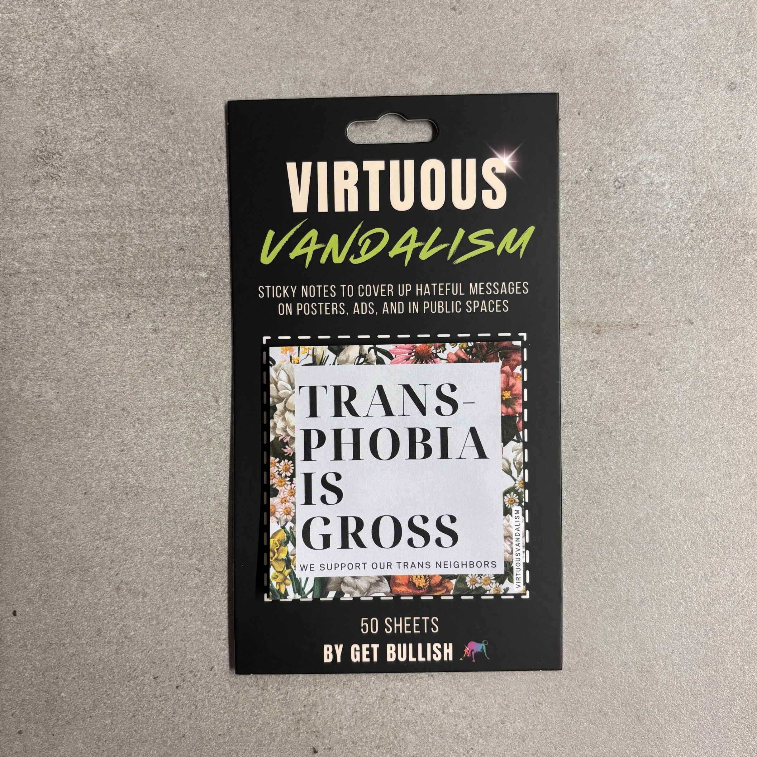 Virtuous Vandalism came about when our founder discovered that a homophobic fast food restaurant was doing a pop-up in her office building, and there were posters in every elevator. Wanting to express displeasure but not wanting to be fined by her landlord, these stickies were born! (Sadly, they arrived well after the homophobic chicken had departed.) Since then, we’ve noticed drastically more offensive signage – even in liberal Brooklyn – and thus our list of topics has increased.