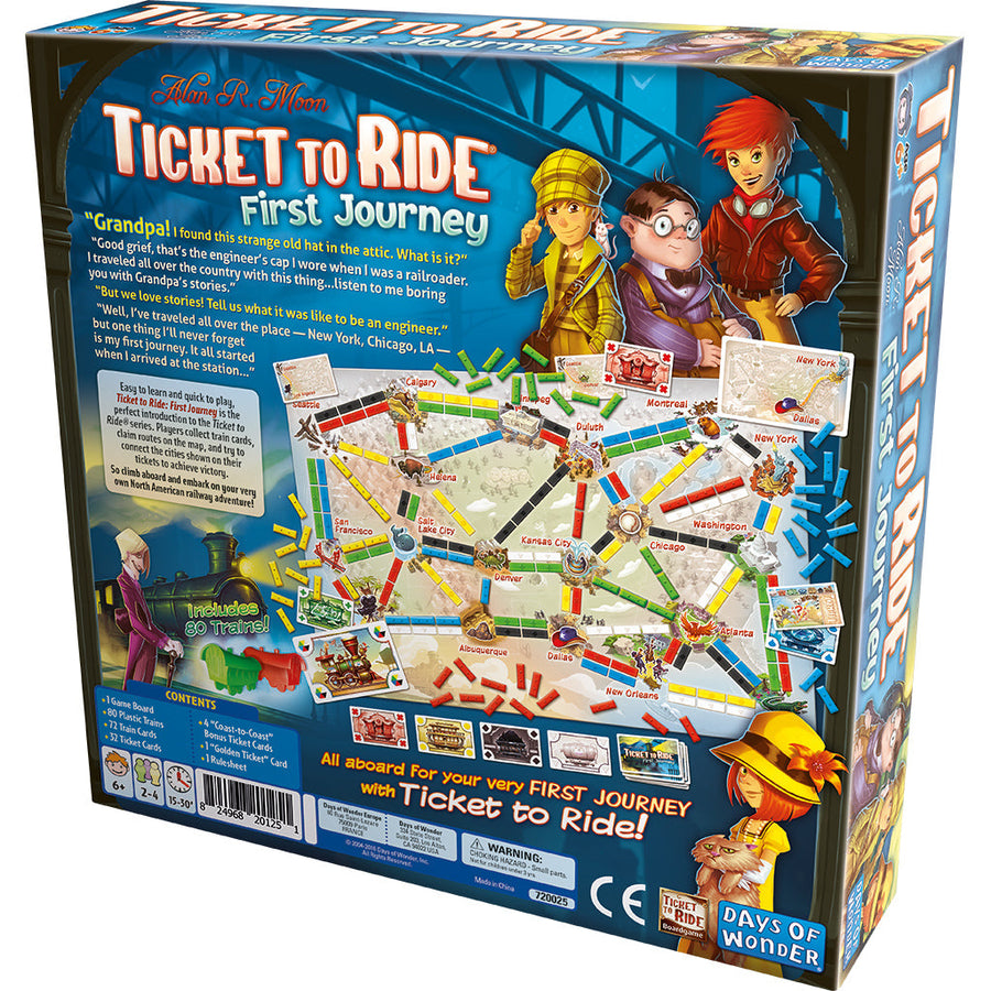 Players of all ages can now venture across America by train in Alan R. Moon's Ticket to Ride: First Journey! With a brand-new map and simplified rules, First Journey is the perfect way to introduce new players to the game of cross-country travel. Just like in Ticket to Ride, players collect train cards, claim routes, and try to connect cities coast-to-coast. In First Journey, though, routes are shorter, train cards are drawn straight from the deck, and the game ends when one player completes six tickets, claiming the Golden Ticket as their prize. Climb aboard, travelers—your incredible First Journey awaits! Learn more on the Days of Wonder website.