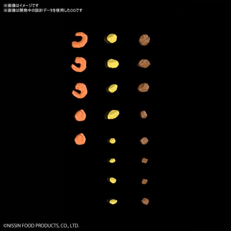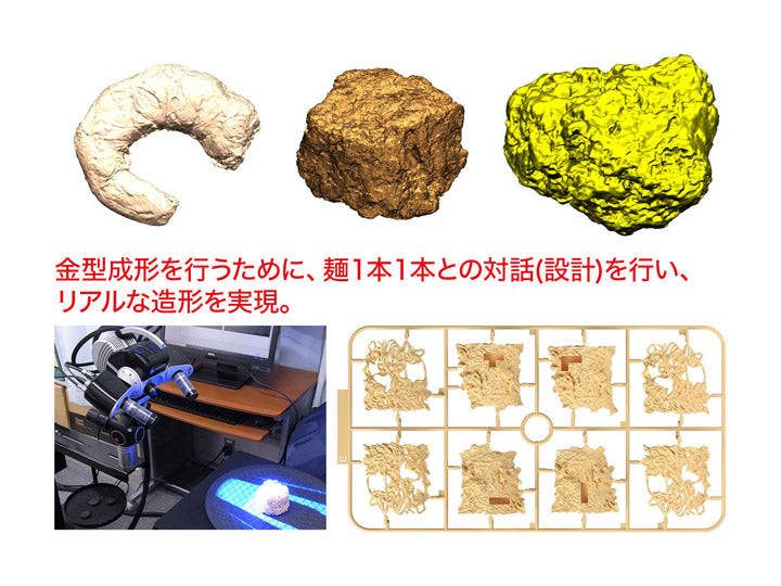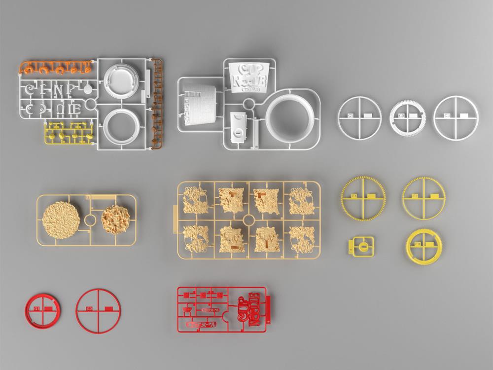 Actual noodles, egg, shrimp, "mystery meat" have been 3D scanned and converted into intricately detailed plastic model parts. The “noodleblock" parts unique to CUP NOODLE have been divided into several parts during the designing process, enabling the rare experience ofassembling the "dense noodle block structure that easily loosens in hot water" in plastic model kit form.