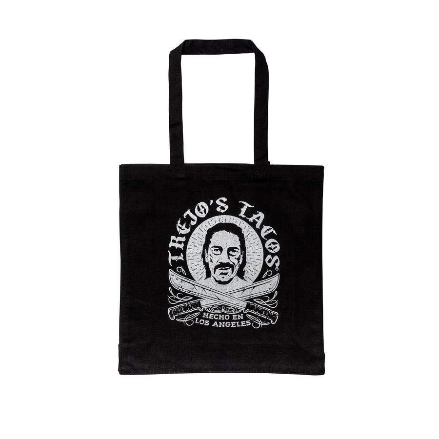 Rock a bold look that's both eco-friendly and taco-tastic with the Trejos Tacos Black Canvas Tote. This tote features the instantly recognizable Trejos Tacos Machete logo, making your love for Trejos known wherever you go.