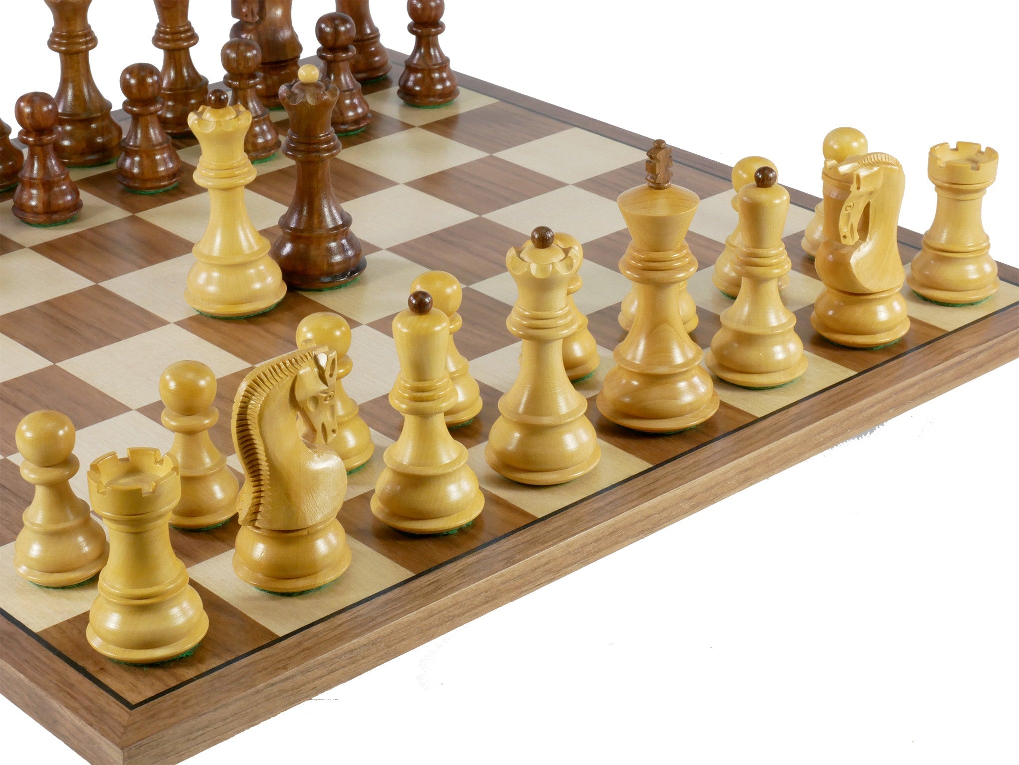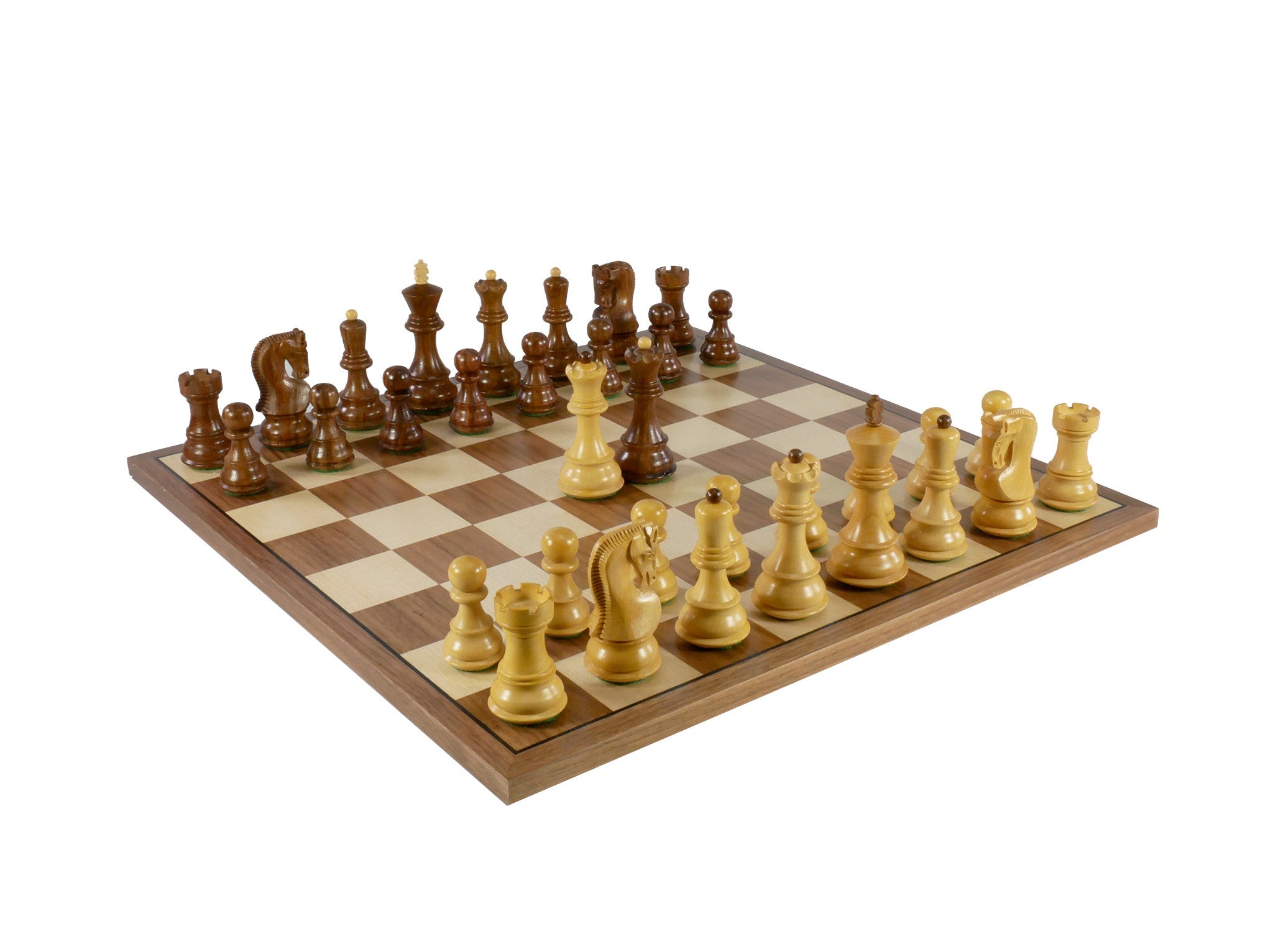 3.75" Sheesham/Boxwood Opposite Tops, Russian Knight on 17" Walnut/Maple Chess Board