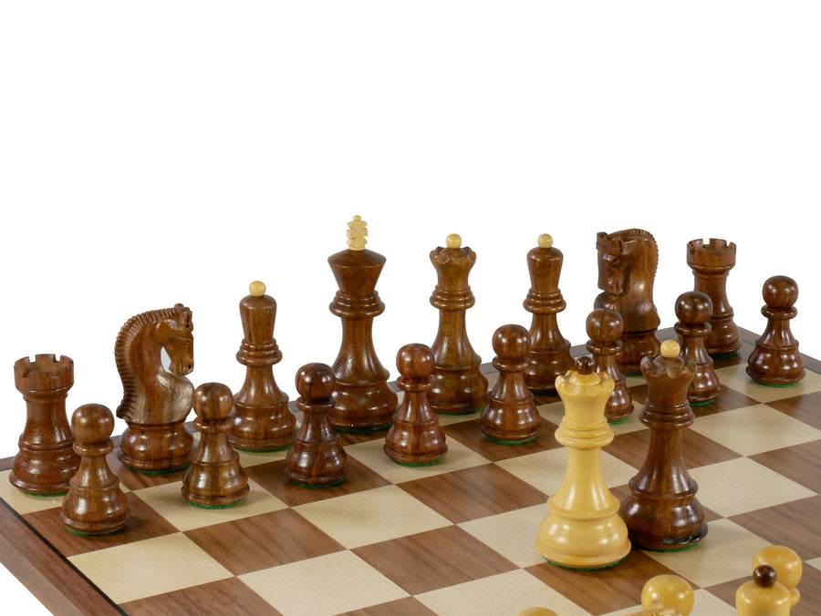 Chess Set - 3.75" Sheesham/Boxwood Opposite Tops on 17" Walnut/Maple Chess Board