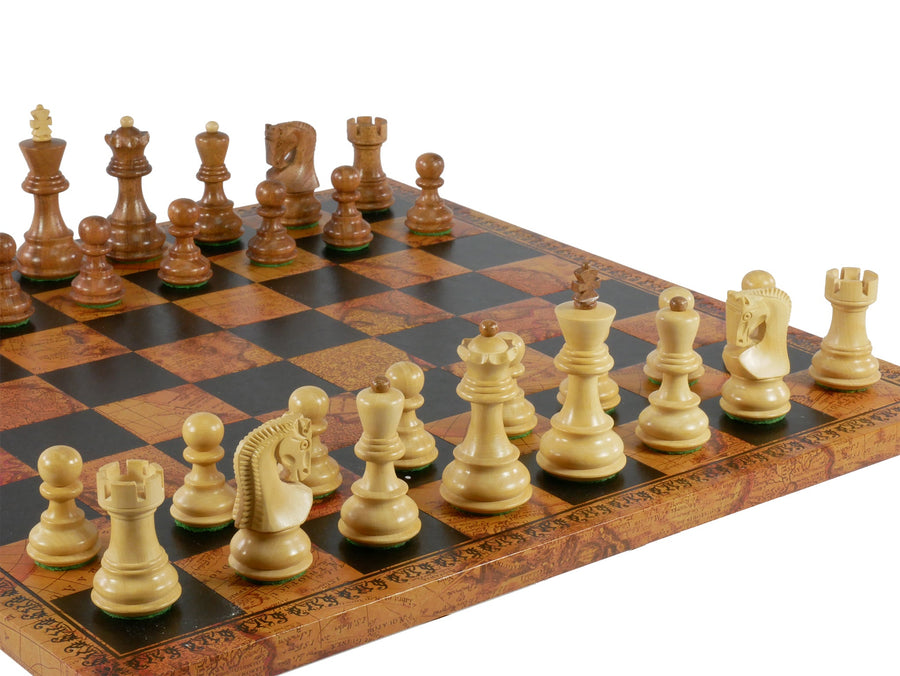 Chess Set - 3" Sheesham/Boxwood Opposite Tops on 15.5" Pressed Leather Map Board