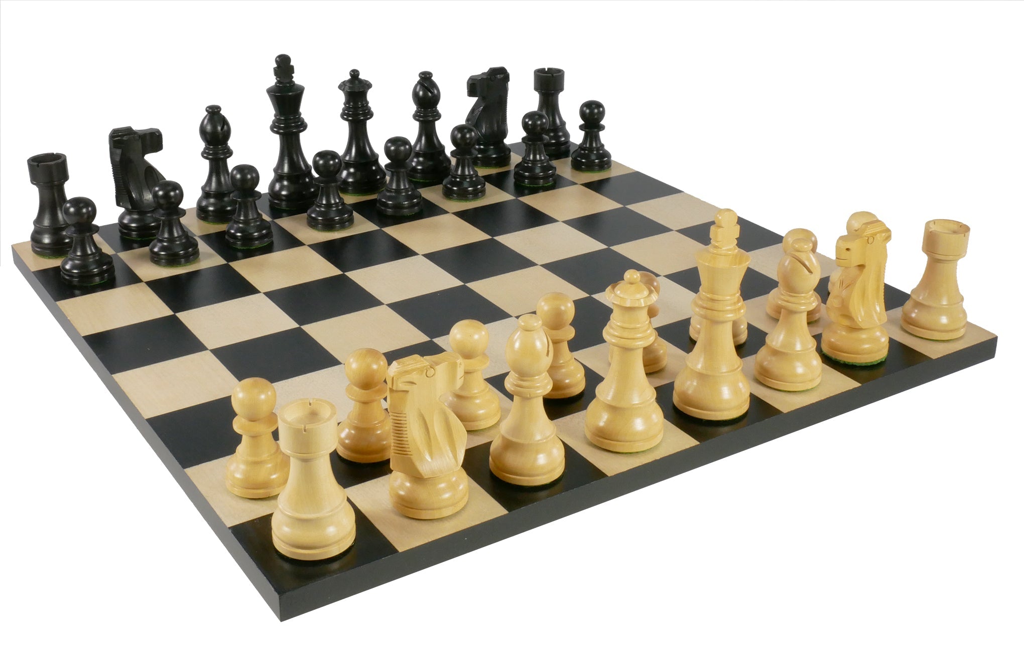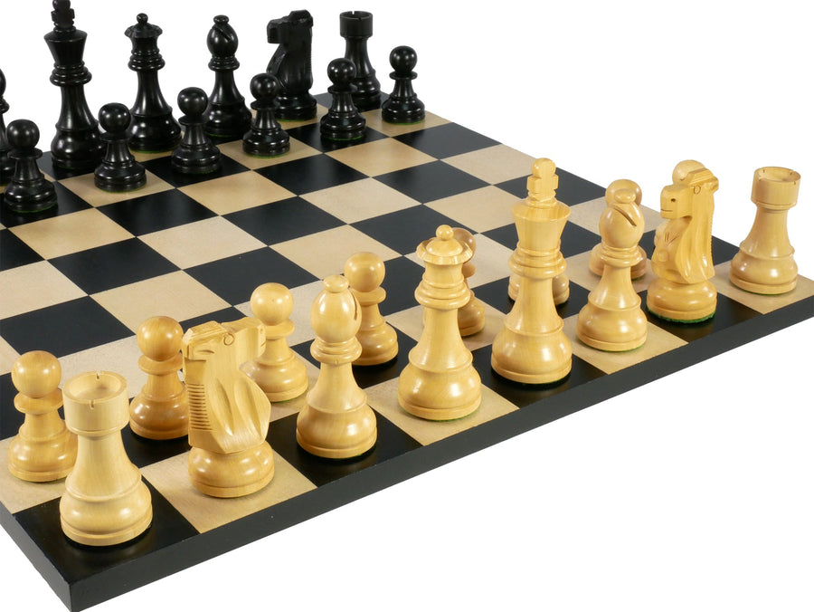 Black/Natural Boxwood French Chessmen Knight, 3.75" King, weighted and felted on 15.75" Black/Maple Inlaid veneer Basic Chess Board with 2" squares.