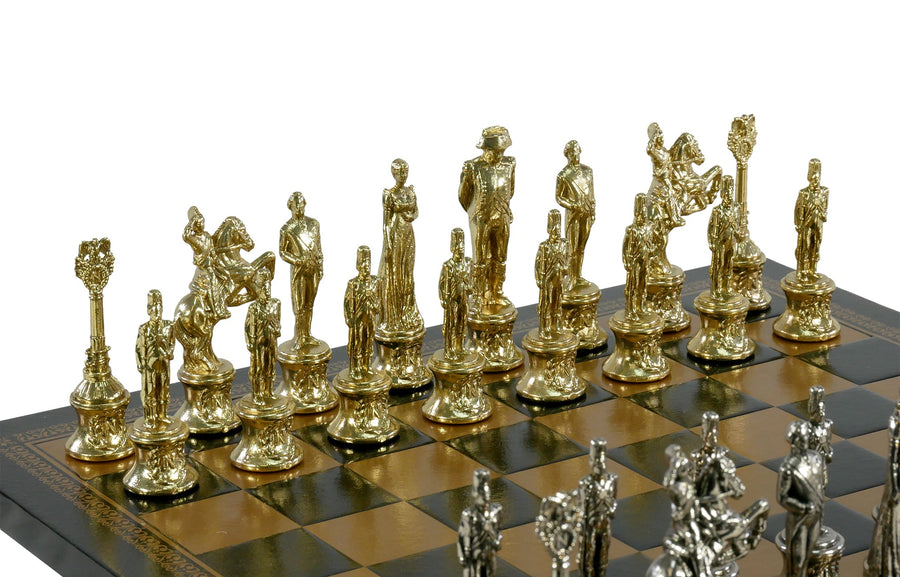 Chessmen with Napoleon Character Metal men with 3.25" King. King base is 1" and felted. Made in Italy. The set weighs 4 pounds. KING: ht. cm.7,5 - diam. cm 2,5. Chessmen are naturally weighted. Sleek design with intricate regal etchings on each piece. These Chess Pieces are paired with a 13" Black/Gold Faux Leather Chess Board. Also made in Italy
