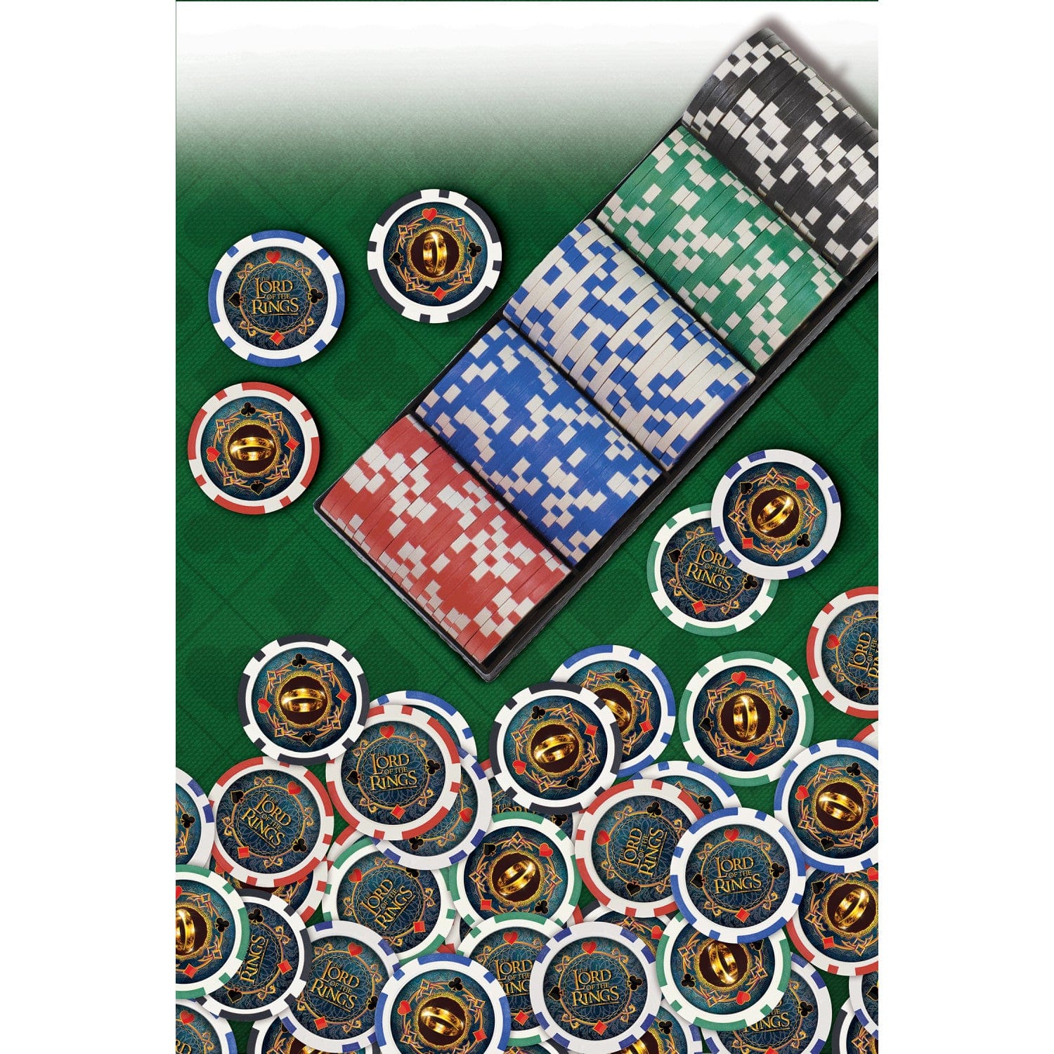 Discover the ultimate luxury poker set for fans of The Lord of the Rings with MasterPieces' Collectible 100 Piece Poker Chips. This custom poker set is a must-have for any enthusiast of the iconic trilogy. Each professional poker chip set includes 100 casino-style chips housed in a sleek black tray, perfect for organizing your poker chip set. These themed poker chips feature two unique designs from The Fellowship of the Ring and The Two Towers, making them ideal for any casino poker chips collection. Crafted from high-quality materials, each chip weighs 11.5 grams, ensuring a premium feel for your game nights. Whether you're playing Texas Hold’em, Blackjack, or hosting a tournament, this poker chip set with tray is designed to elevate your experience. Officially licensed by Warner Bros. Entertainment Inc., these poker chips guarantee authenticity and quality. With dimensions of 8.5 x 3.27 x 3.27 inches and a weight of 2.63 pounds, this small poker set is easy to store and transport. Perfect for families and card clubs, this nice poker set is a great addition to any game collection. Enjoy the thrill of a casino experience at home with this collectible poker chip set, and immerse yourself in the world of Middle-earth.
