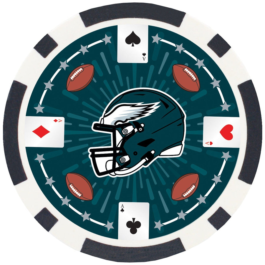 Show your Philadelphia Eagles pride at every game night with this officially licensed NFL poker chip set, featuring 100 professional-grade, 11.5-gram casino-style poker chips in a sturdy black tray for easy storage and organization. Perfect for Texas Hold'Em, Blackjack, and other card games, these standard-colored chips showcase authentic team designs, making them a must-have for any Eagles fan or collector of NFL team poker chips. Whether you’re hosting a tournament or enjoying a casual poker night, this poker set delivers the look and feel of a real casino experience. The heavy-weight chips offer a satisfying feel in hand, while the included tray keeps your set organized and ready for play. Ideal for fans looking to expand their collection of NFL poker chips or searching for the perfect gift for football enthusiasts, this set pairs perfectly with Philadelphia Eagle playing cards and complements collections that include other teams like the Ravens, Bears, Steelers, or Browns. Designed by MasterPieces, an American puzzle and game company, this set is crafted for durability and long-lasting enjoyment. Elevate your next game night, tailgate, or sports-themed party with this high-quality NFL poker chip set and show your team spirit in style.
