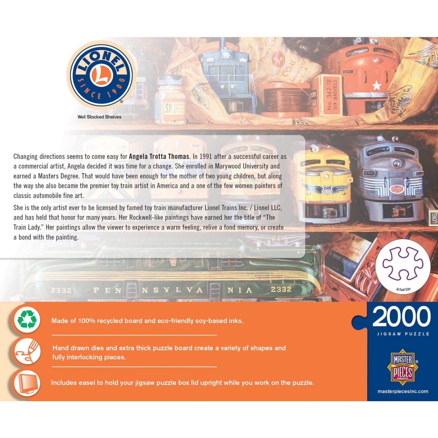 These MasterPieces Lionel Trains 27" x 39" 2000pc Puzzles are sure to become family favorites. Most collectible then ever before the Classic Lionel trains bring back fond memories of family times.  Train collectors are sure to love the incredible details and accurate renditions of these American classics. Puzzles with 2000 pieces or more are crafted using multiple die-cutting machines, allowing us to create large, intricate puzzles with stunning detail. Due to the complexity of the process, slight variations in alignment may occur, giving each finished puzzle its own unique character and charm—making it a truly one-of-a-kind experience for enthusiasts. To reduce their impact on our environment, the chipboard used in these puzzles is made of 100% recycled material.