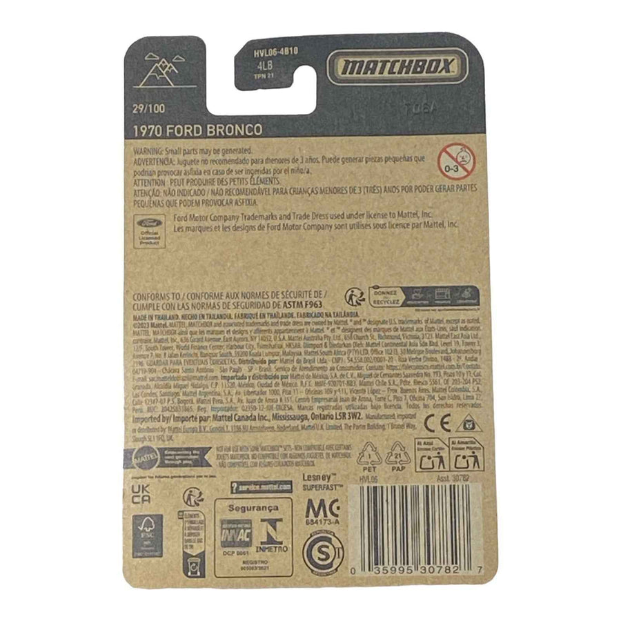 The Matchbox 1970 Ford Bronco is a remarkable die-cast model that captures the essence of a classic American SUV. This model is part of the Matchbox Series, specifically positioned at 29/100, and pays homage to an era where rugged design met unparalleled utility. With its detailed craftsmanship and vibrant colors, the Matchbox 1970 Ford Bronco stands out in any collection.