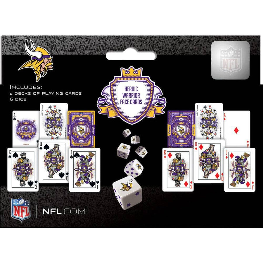 Dive into the world of NFL excitement with the Masterpieces Officially Licensed NFL Minnesota Vikings 2-Pack Playing Cards & Dice Set. Perfect for any Minnesota Vikings fan, this set includes two decks of poker-sized playing cards, each measuring 3.5" x 2.5", and five standard-sized dice. Each card deck features 52 playing cards and 2 Jokers, all adorned with custom Minnesota Vikings team designs on the face cards, Jokers, and Ace of Spades. This set is not just a game; it's a celebration of your favorite team, making it an ideal addition to your collection of sports-fan games. Whether you're hosting a game night or looking for the perfect gift for a fellow Vikings enthusiast, this set is a must-have. The officially licensed NFL product ensures authenticity and quality, while the team colors and unique designs make it a standout piece. With a compact size and lightweight design, it's easy to take your Vikings pride on the go. This set is perfect for adults and makes a great addition to any game room or tailgate party. Embrace the spirit of the game with this Minnesota Vikings matching game set, and enjoy endless hours of fun and competition.