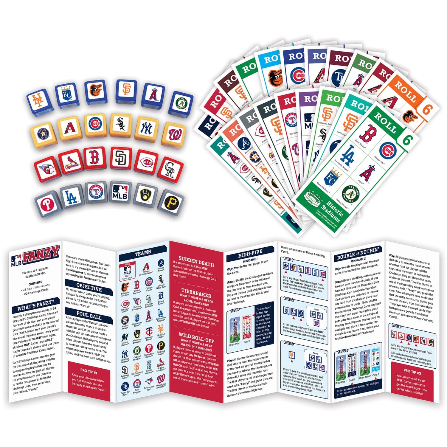 Face off in this MLB Fanzy speed dice game featuring all 30 MLB Teams. Be the first to call out “Fanzy” and win cards in this fast-paced family game thriller. This game can be played with 2-4 players and is good for ages 6+. Playtime is around 8 minutes long. This game comes with 20 playing cards, 24 dice, and Instructions which have bonus mini games for extended play. It's simple to learn and quick to play!