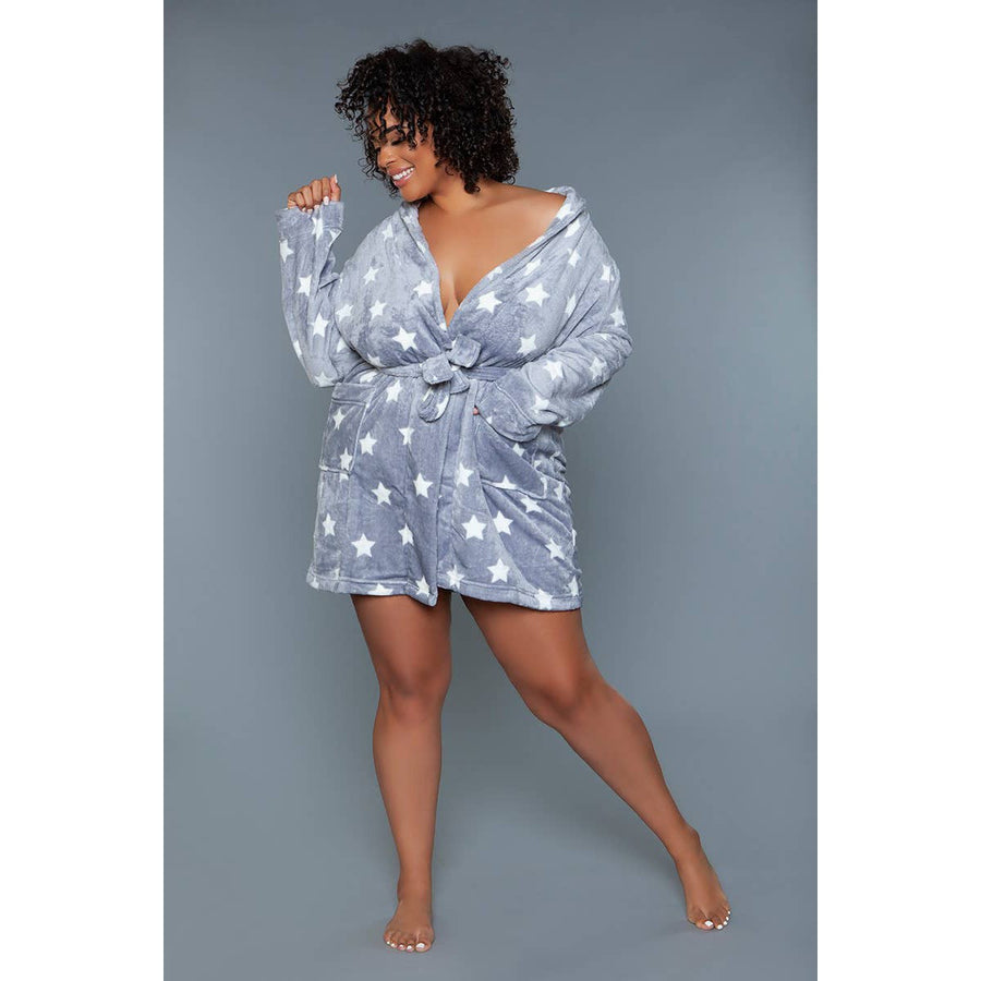 Mid-Length plush robe with star print design and self-tie waist closure.