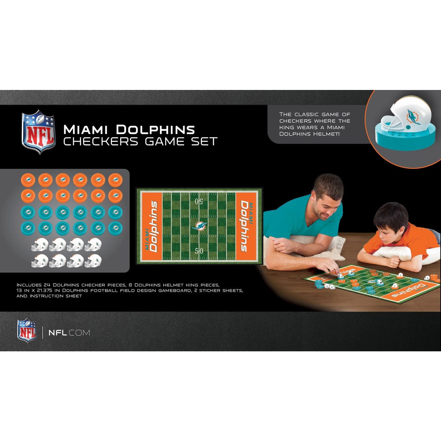 This MasterPieces NFL Miami Dolphins Checkers Game is the classic game of checkers where the king wears a Miami Dolphins football helmet! The Miami Dolphins checkers game includes 24 Miami Dolphins checkers pieces, 8 Miami Dolphins football helmet king pieces, a 13" x 21.375" Miami Dolphins game board, 1 sticker sheet, and an instruction sheet.