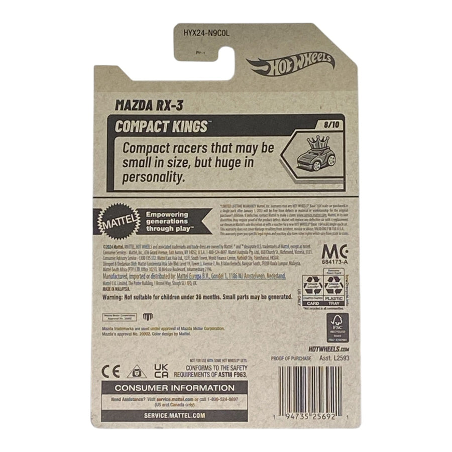 Ignite your collection with the Hot Wheels Mazda RX-3 from the Compact Kings Series 8/10! This vibrant die-cast model captures the iconic 1970s Mazda RX-3 with its sleek design and bold detailing, perfect for JDM enthusiasts and Hot Wheels collectors. Ideal for display or high-speed play, it’s a retro gem for any lineup.