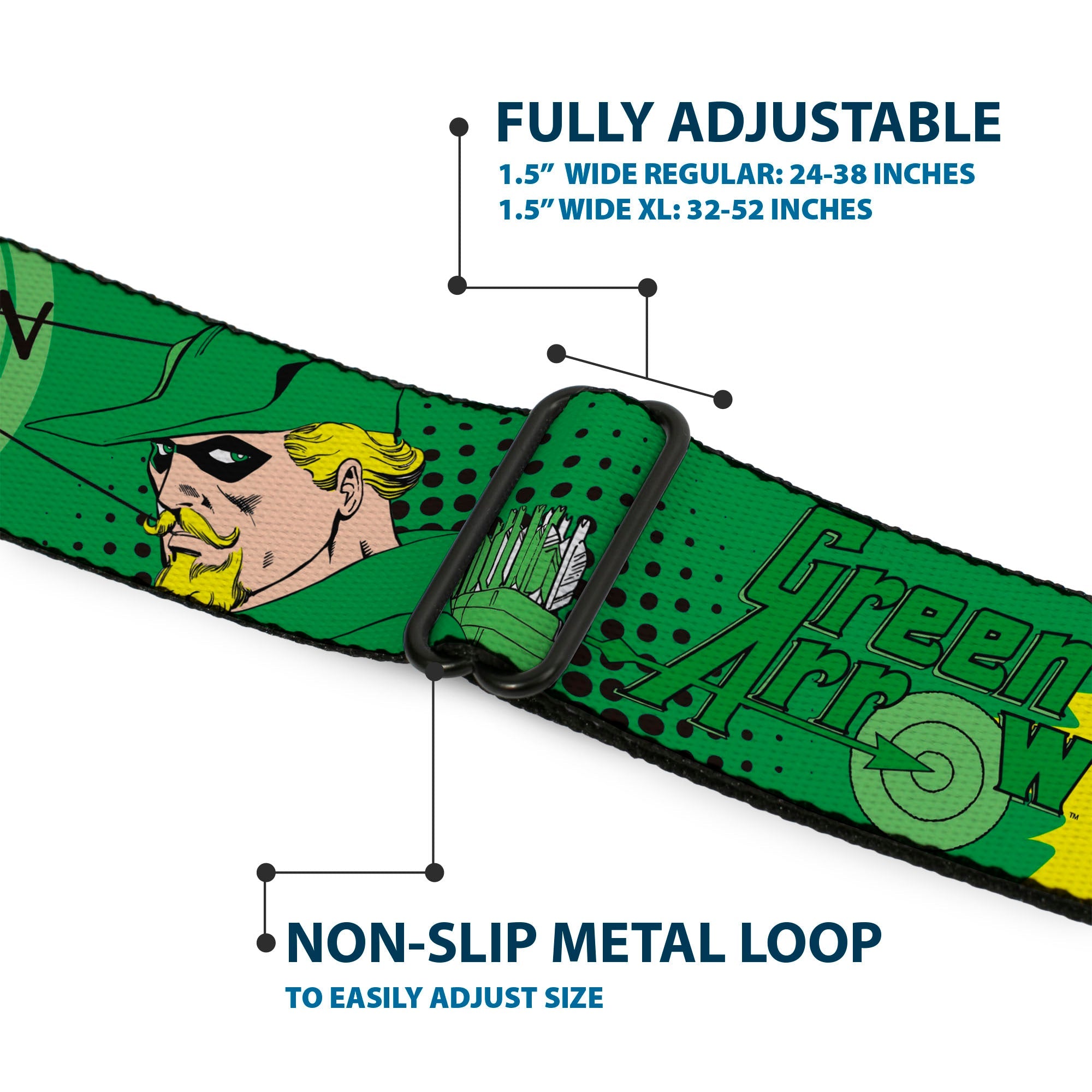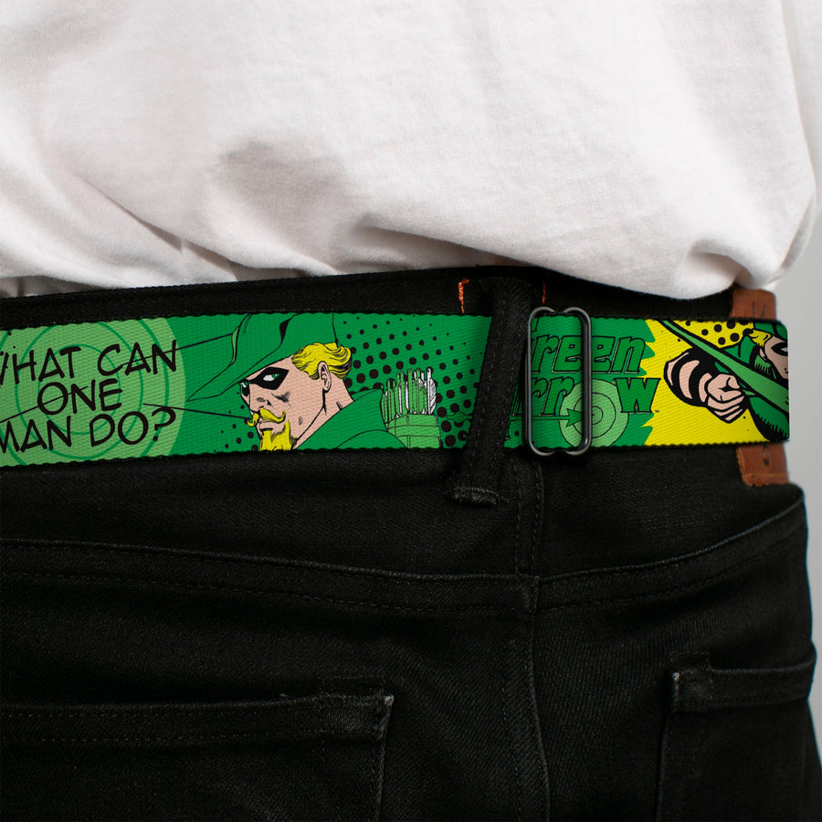 GREEN ARROW Logo Full Color Black Green Seatbelt Belt - GREEN ARROW Poses WHAT CAN ONE MAN DO? Greens/Black Webbing