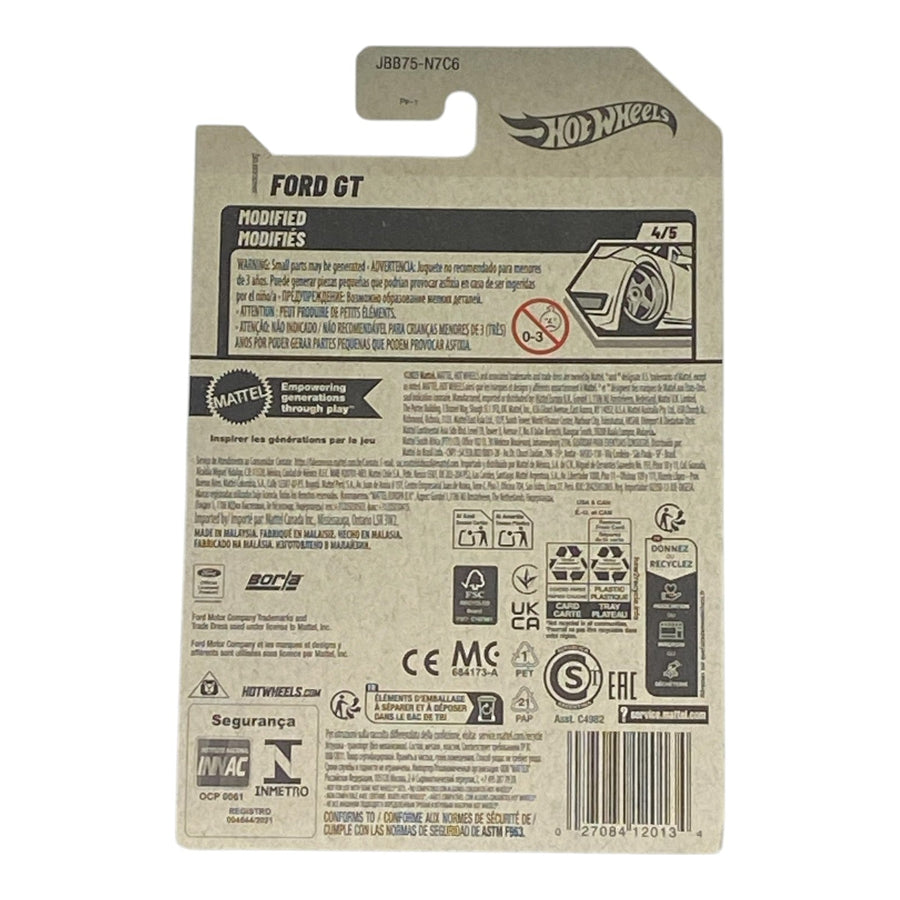 Dominate the track with the black Hot Wheels Ford GT from the Modified Series 4/5! This 2025 mainline powerhouse (#159/250) is a 1:64 scale die-cast icon, reimagining Ford’s Le Mans legend in stealth black with bold red racing stripes, wide-body aero, and an ultra-low profile that screams custom-tuned fury. Equipped with tinted windows, red-rimmed OH5 wheels, and a black plastic base, it conquers loops, drifts, and launches with championship precision on orange tracks. Perfect for kids 3+ and serious collectors, this black-and-red beast fuses real-world heritage with Hot Wheels fantasy for epic play or display.