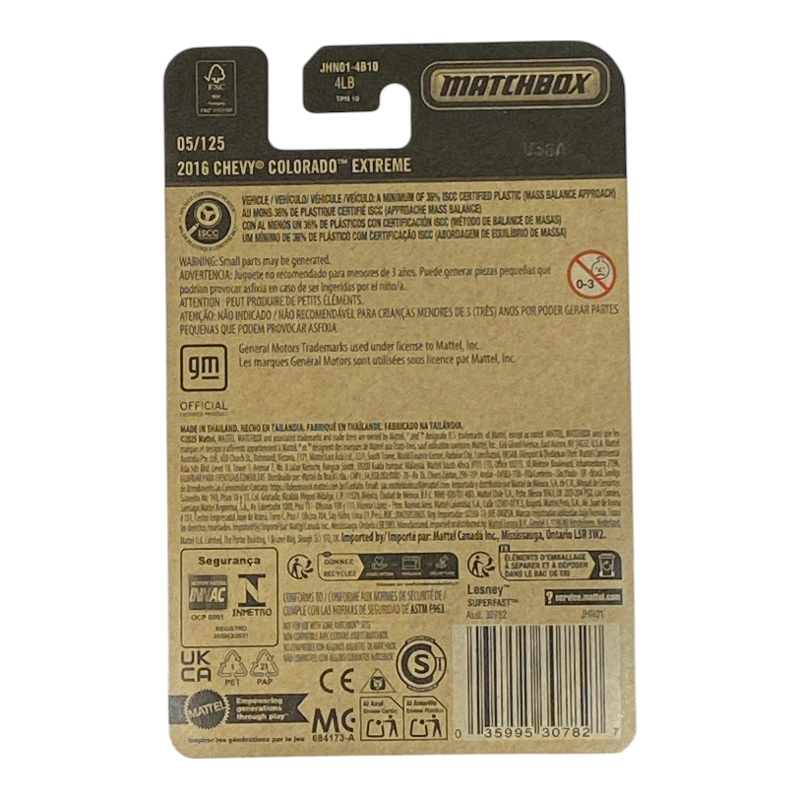 Discover the Matchbox 2016 Chevy Colorado Extreme – 2026 Series 05/125, a rugged powerhouse in the iconic Matchbox 1:64 scale mainline collection! This aggressive off-road edition of the 2016 Chevrolet Colorado captures the bold styling of the real-world Extreme trim, complete with lifted suspension, beefy tires, bold graphics, and adventure-ready attitude. Released early in 2026 as #05/125, this fresh variation (often in striking black with orange accents or similar high-impact colors) is a standout in the lineup. Perfect for Chevy truck fans, off-road enthusiasts, and collectors chasing tough modern pickups – add this high-performance diecast beast to your display or adventure fleet today!