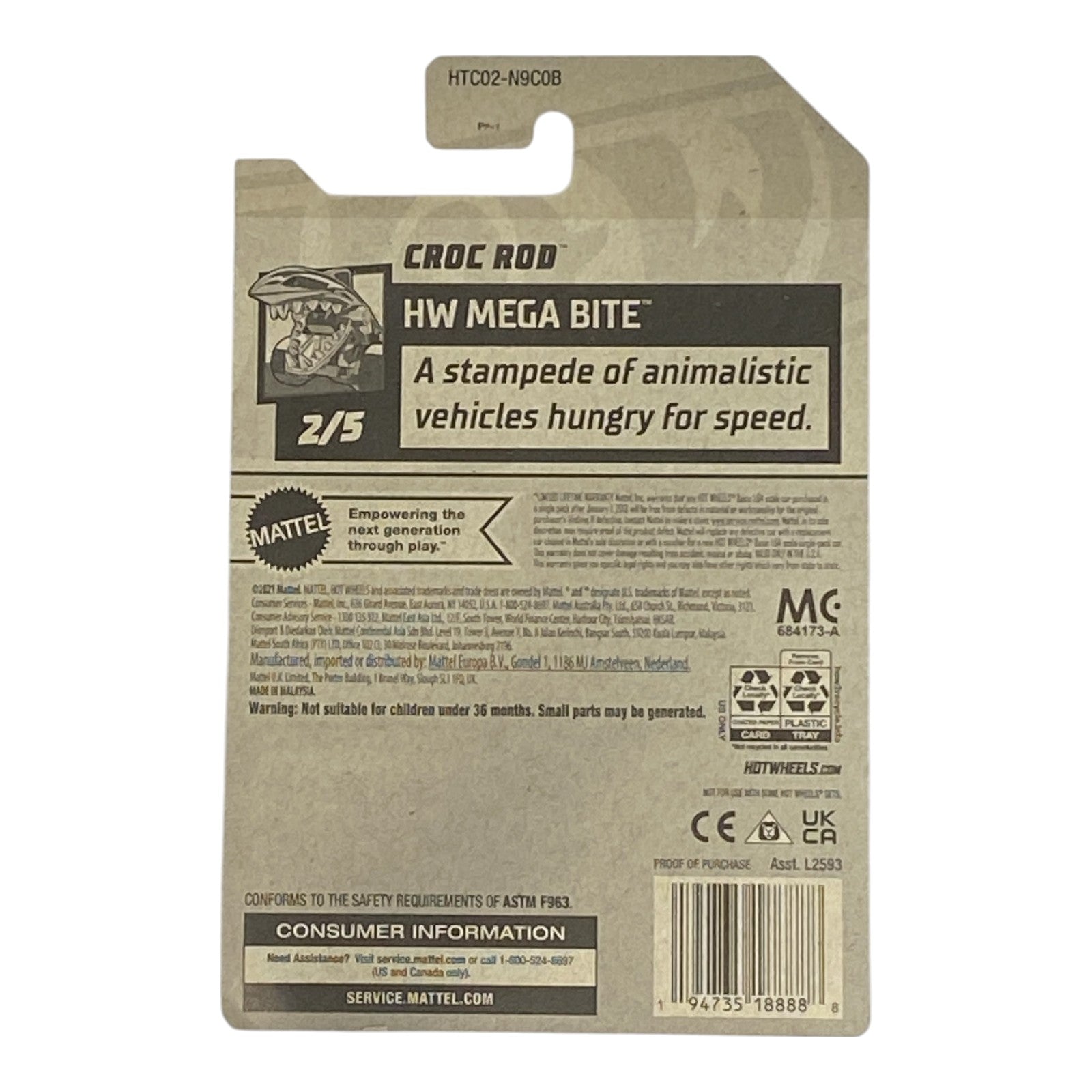 Discover the Hot Wheels Croc Rod from the 2024 HW Mega Bite Series (2/5, Collector #39/250) – a ferocious open-wheel race car shaped like a menacing crocodile, ready to chomp the competition on any track. This 1:64 scale diecast beast combines wild animal-inspired design with high-speed performance, featuring exposed engines and a jaw-dropping reptilian body that's perfect for thrilling races and bold displays.