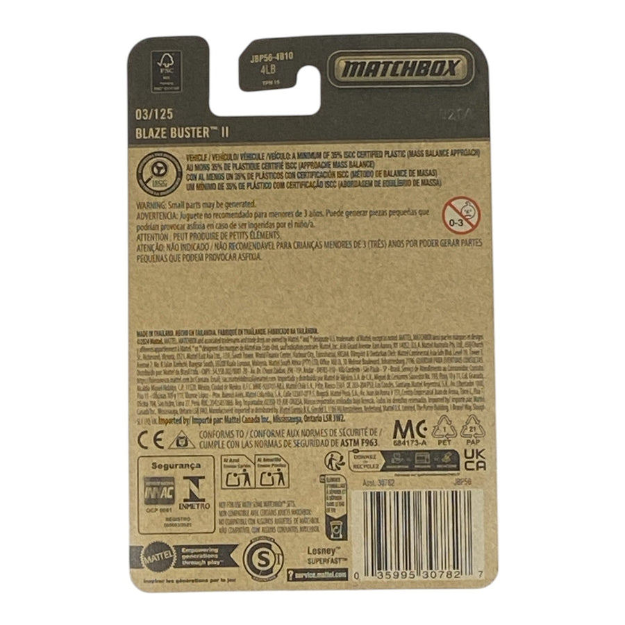 Discover the Matchbox Blaze Buster II (#03/125) from the 2025 Mainline series – an exciting 1:64 scale diecast replica of a powerful modern fire engine truck. This detailed collector's item features realistic firefighting elements like ladders, hoses, and emergency markings, with rolling wheels and premium metal construction, perfect for Matchbox fans, fire truck enthusiasts, and young rescuers.