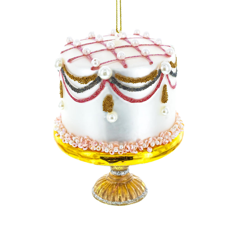 Pearl-Adorned Celebration Cake Glass Christmas Ornament