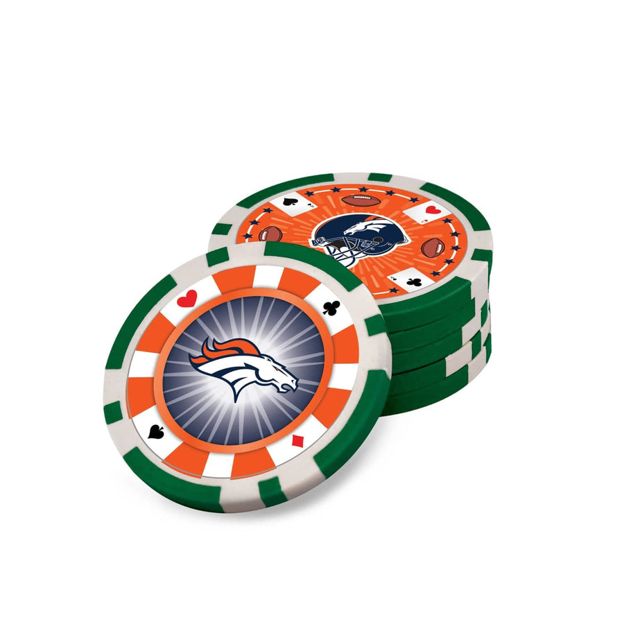 Looking for a great way to support your favorite team on poker night? Well, ante up with MasterPieces officially licensed NFL Denver Broncos 300 Piece Casino Style Poker Chips! These heavy 11.5-gram chips are perfect for Texas Hold'EM, Blackjack, card games, and much more. The poker set includes 300 high-quality standard-colored poker chips (11.5g) featuring two unique team designs. 60 White Chips, 60 Red Chips, 60 Blue Chips, 60 Green Chips, and 60 Black Chips. 6 standard-size (16mm) dice featuring your team's logo and colors on each die, 2 decks of playing cards with card-back designs featuring your favorite team's logo. All face cards and jokers have detailed custom team designs. 1 dealer button. Plus, an easy-to-carry sturdy aluminum case has a black velour interior to protect and organize poker chips, playing cards, and dice.