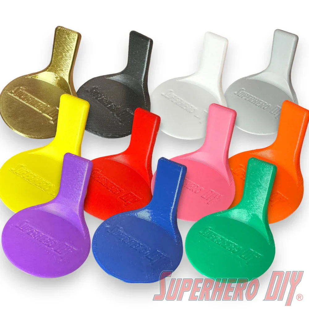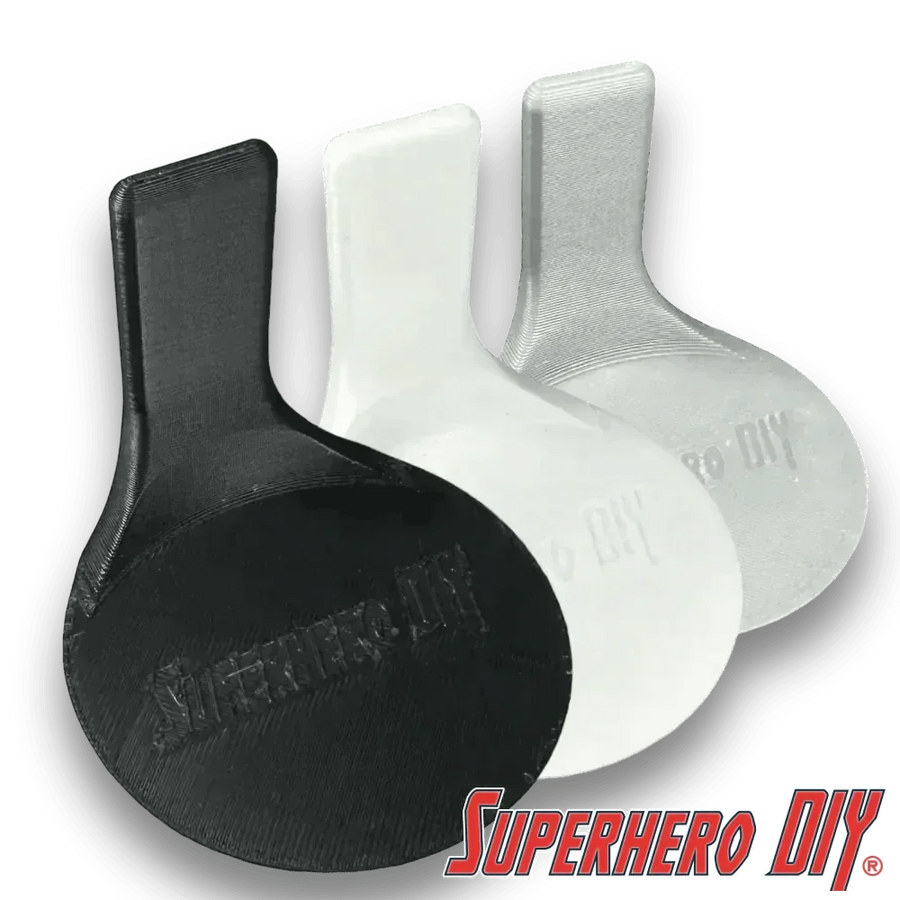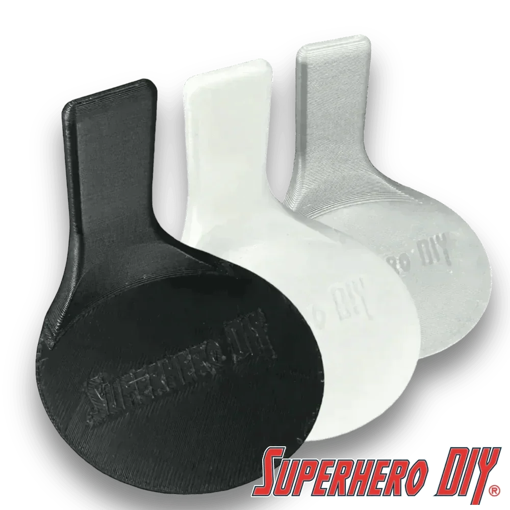 These stands are 3D-printed using durable PLA plastic, resulting in a clean and smooth finish. Each stand measures 2.5" wide x 2.7" deep x 2.25" tall and includes one 3M Command strip for hassle-free mounting.