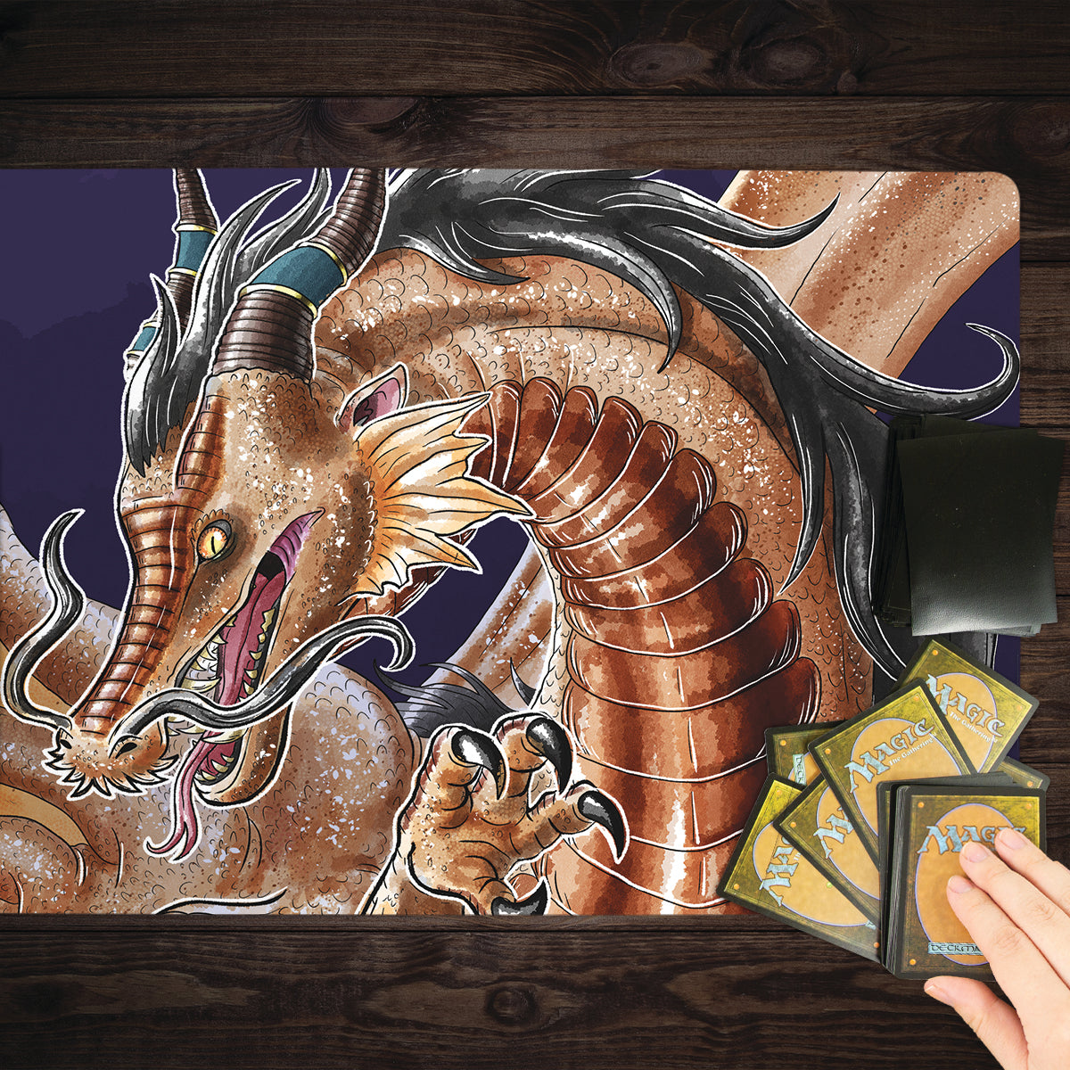 Standard Playmat measures at 24” x 14” inches and is 1/16 of an inch thick. It’s made with a smooth cloth top and strong rubber backing.