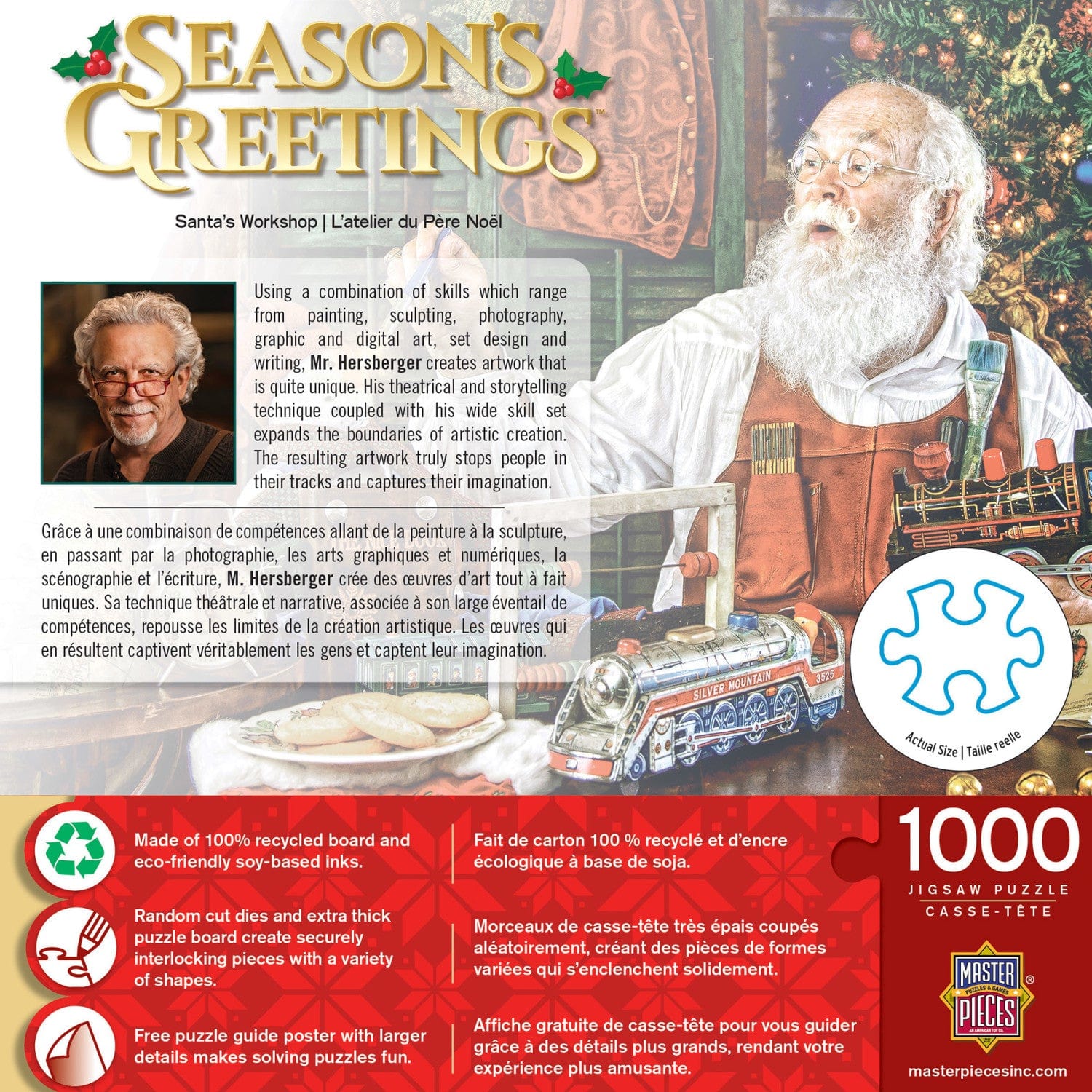 These MasterPieces 19.25" x 26.75" 1000pc of Home for the Holidays features a touch of magic to make toys come to life in Santa's Workshop. The tree is decorated and the toys are made. Santa is putting the finishing touches for good boys and girls.. Holiday Puzzles are the perfect way to get into the holiday spirit, and the perfect holiday presents for friends and family. Cozy up around the table for some holiday family fun! To reduce their impact on our environment, the chipboard used in these puzzles is made of 100% recycled material