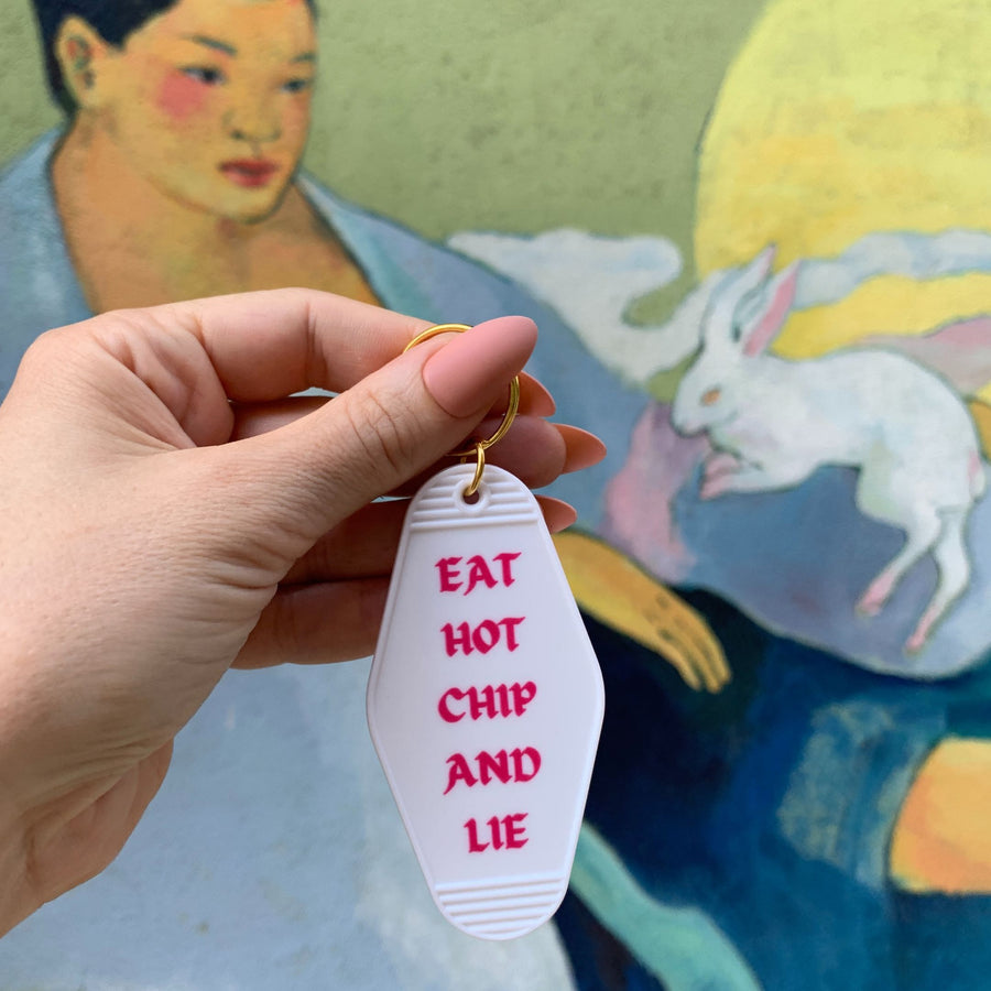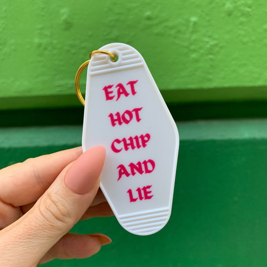 Keychain reads EAT HOT CHIP AND LIE in motel style design.
