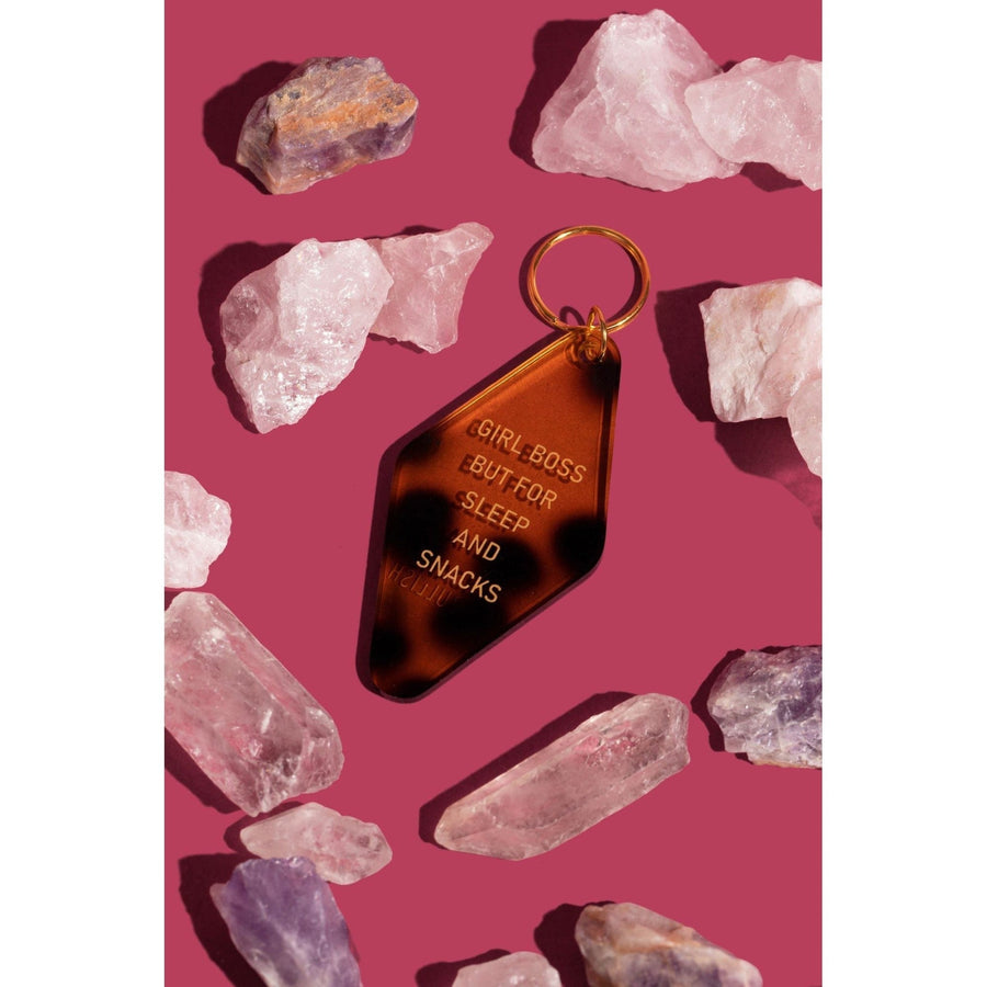 Translucent tortoise shell print keychain reads GIRL BOSS BUT FOR SLEEP AND SNACKS