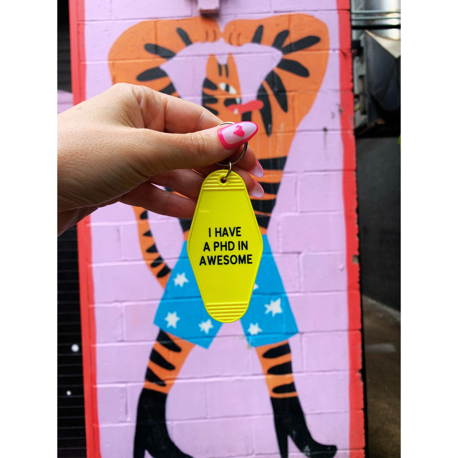 Yellow keychain reads: I HAVE A PHD IN AWESOME in black lettering