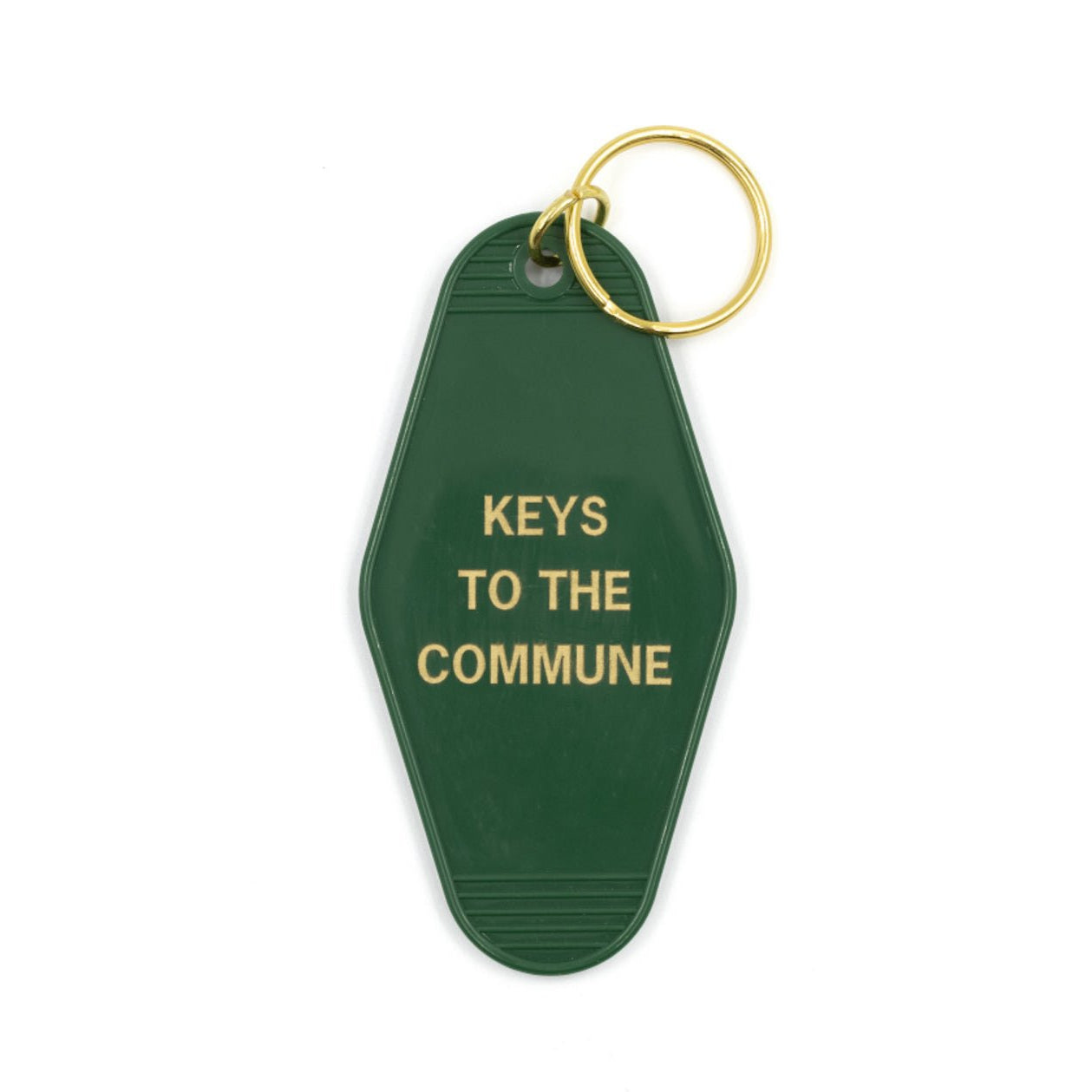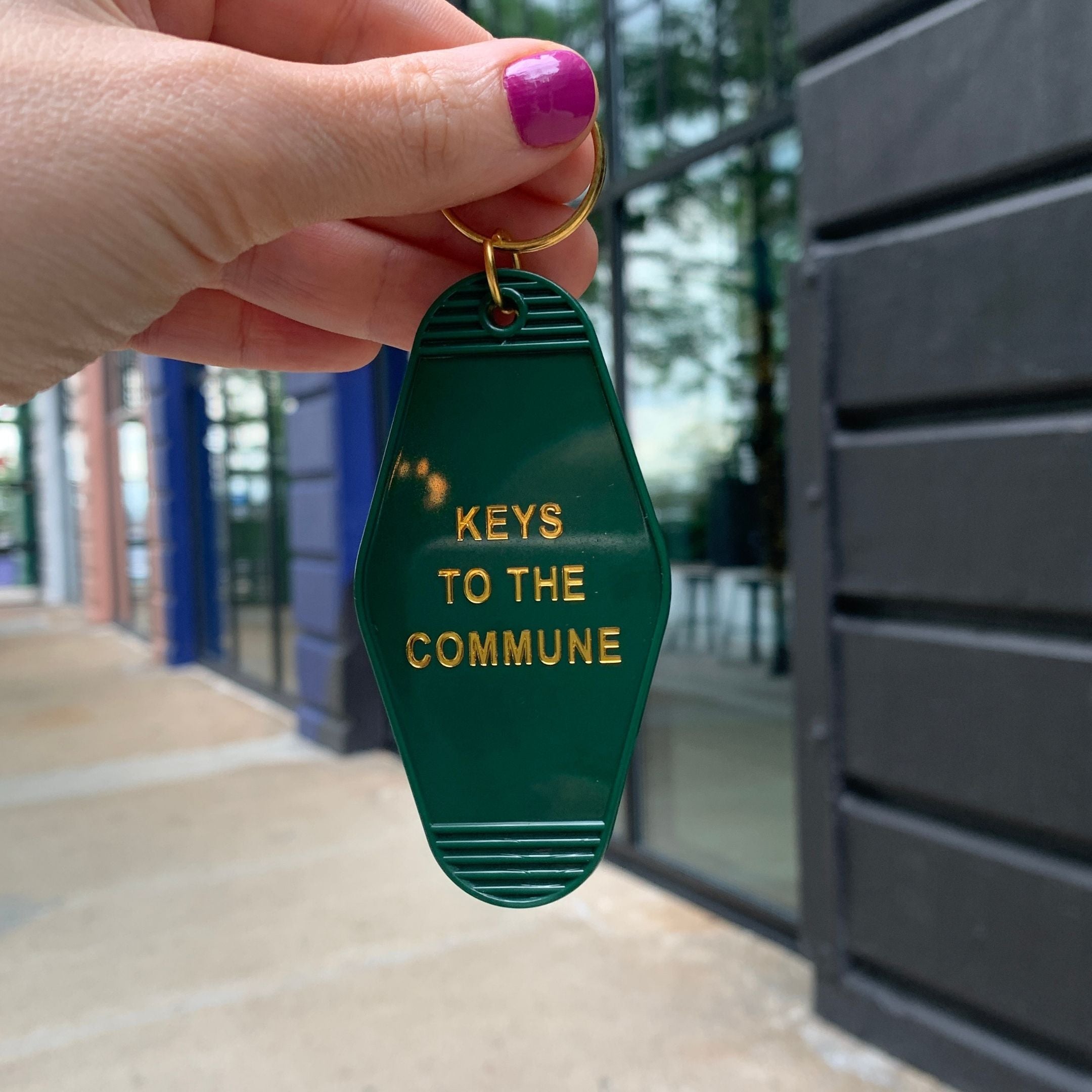 Looking for unique vintage-inspired keychains with a twist? This retro motel-style keychain combines nostalgic design with witty (communal? communist?) humor, featuring bold green and gold colors that make it easy to spot in your bag. Perfect for anyone who loves collectible keychains, mid-century motel aesthetics, or just wants to make a statement about communal living.