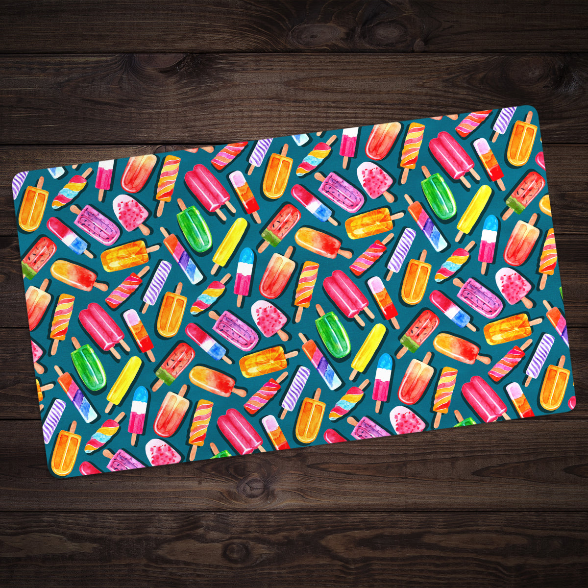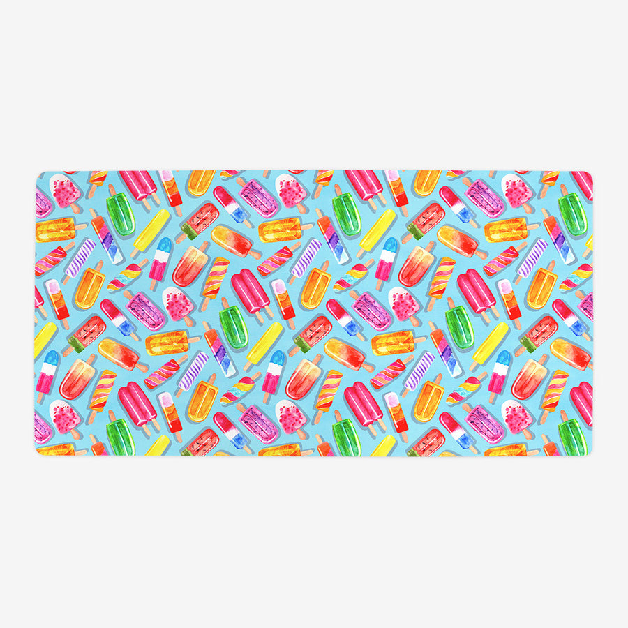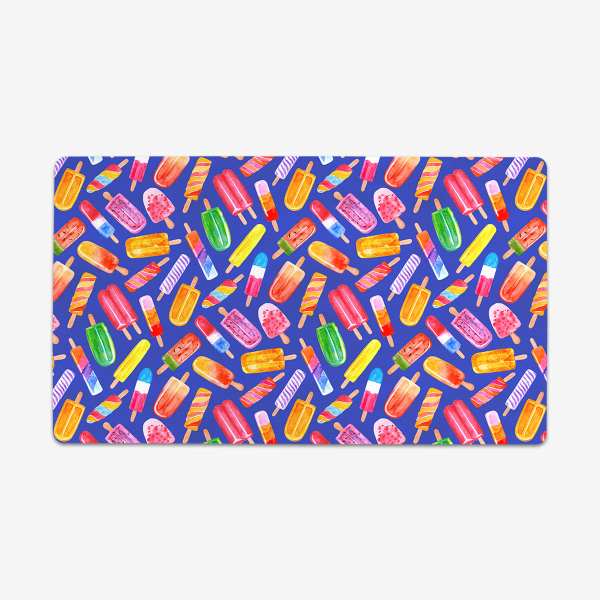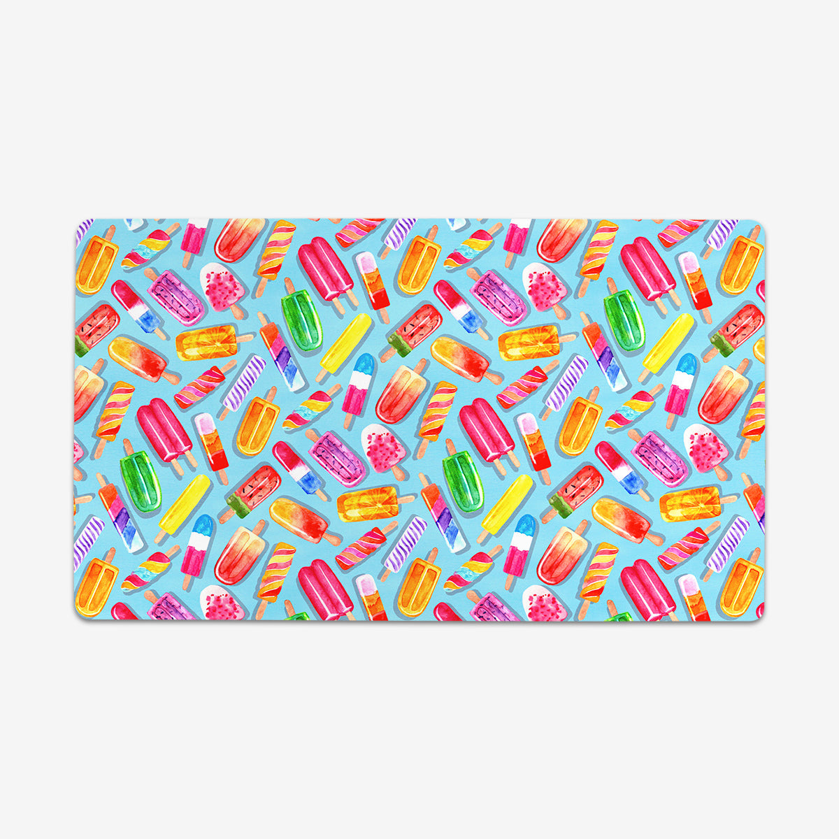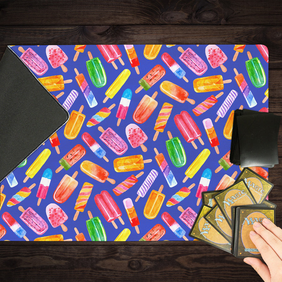 Oversized Playmat measures at 28” x 14” inches and is 1/16 of an inch thick. It’s made with a smooth cloth top and strong rubber backing.
