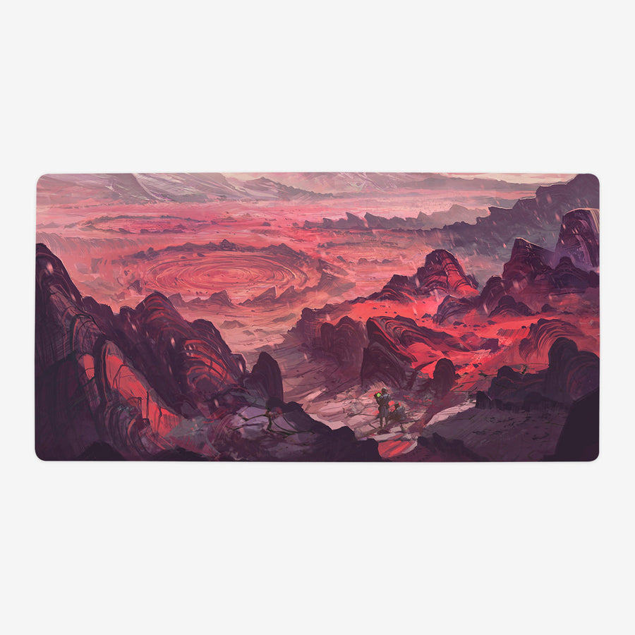 Oversized Playmat measures at 28” x 14” inches and is 1/16 of an inch thick. It’s made with a smooth cloth top and strong rubber backing.