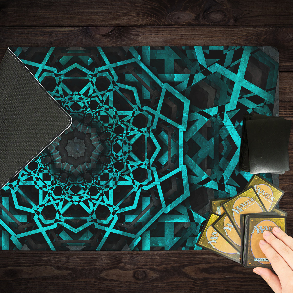 Standard Playmat measures at 24” x 14” inches and is 1/16 of an inch thick. It’s made with a smooth cloth top and strong rubber backing.