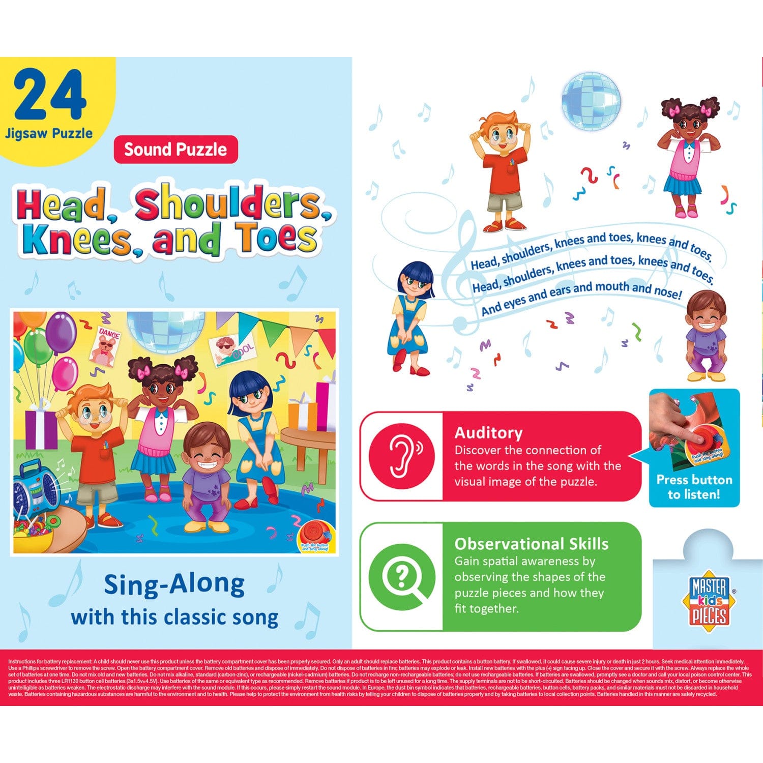This MasterPieces 24pc 18"x24" Head, Shoulders, Knees, and Toes Sound Puzzle is sure to get your child singing and learning with its catchy classic tune. Our 24pc Sound Floor Puzzles are both educational and fun. Complete the puzzle and push the button to sing "Head, Shoulders, Knees, and Toes" and learn your body parts. Our Sound Floor Puzzles are perfect for children ages 3-8.