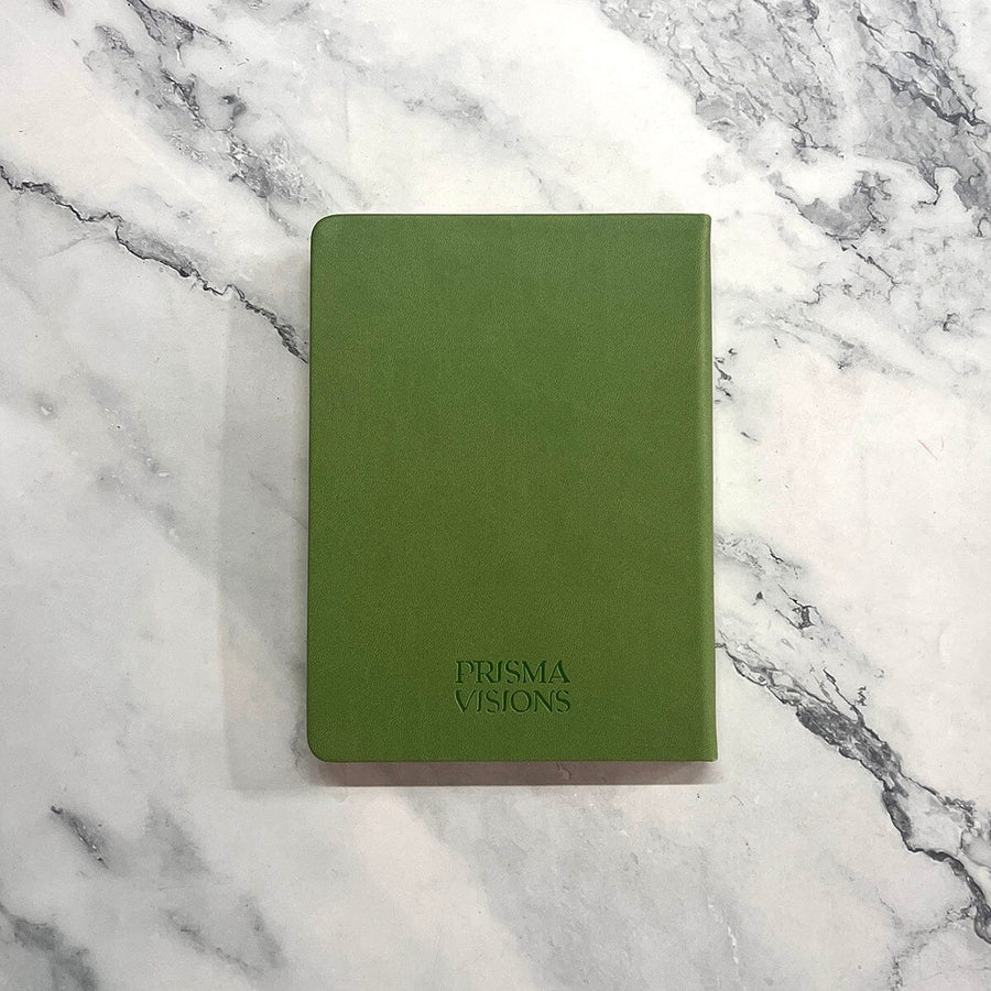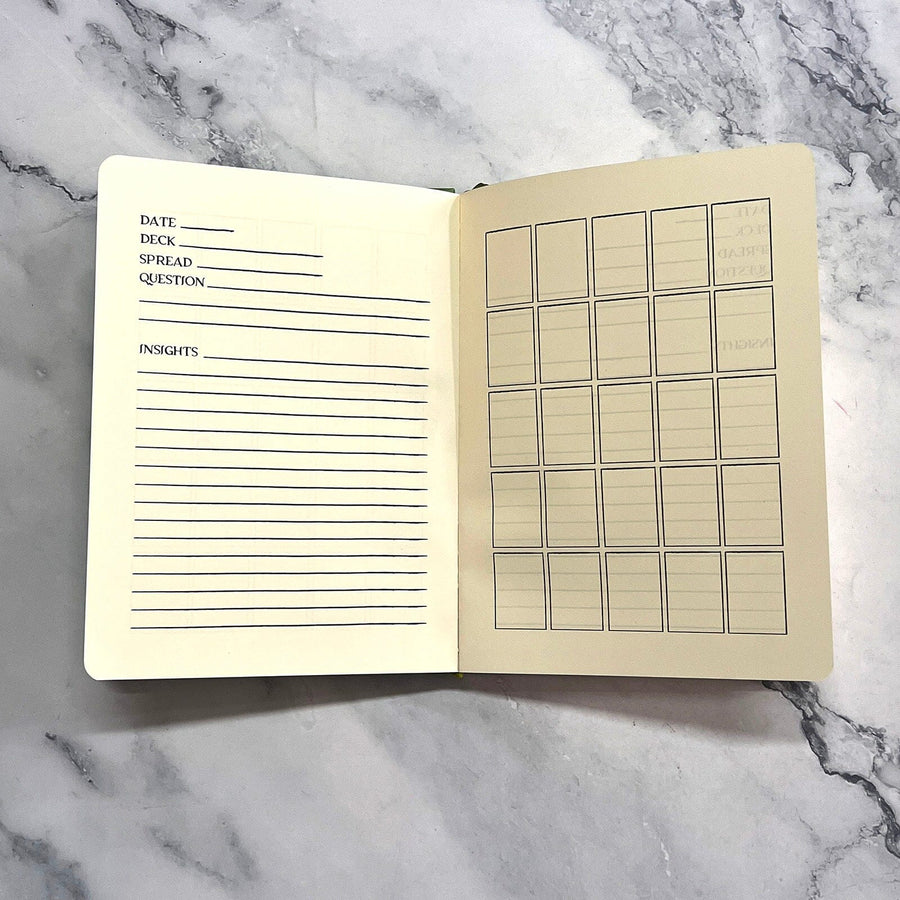 The book measures approximately 5.75" x 7.5" and includes a page for documenting your spread, question, and insights as well as a corresponding page for mapping out the placement of your cards. The diary is bound with a sage green faux-leather cover.