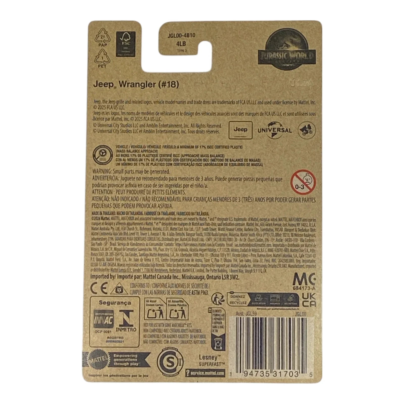Rev up prehistoric adventures with the Matchbox Jeep Wrangler #18 from the pulse-pounding Jurassic World Rebirth Collection! This rugged 1:64 scale die-cast icon storms onto the scene with authentic Jeep styling, bold Jurassic World Rebirth branding, and claw-scarred details that scream survival. Perfect for young paleontologists and Matchbox fans, it features free-rolling off-road wheels, a durable metal chassis, and compatibility with Jurassic Park playsets for non-stop dino escapes. Collectors, grab this limited #18 edition before it vanishes into the jungle—search Jurassic World Matchbox Jeep today and fuel epic storytelling!