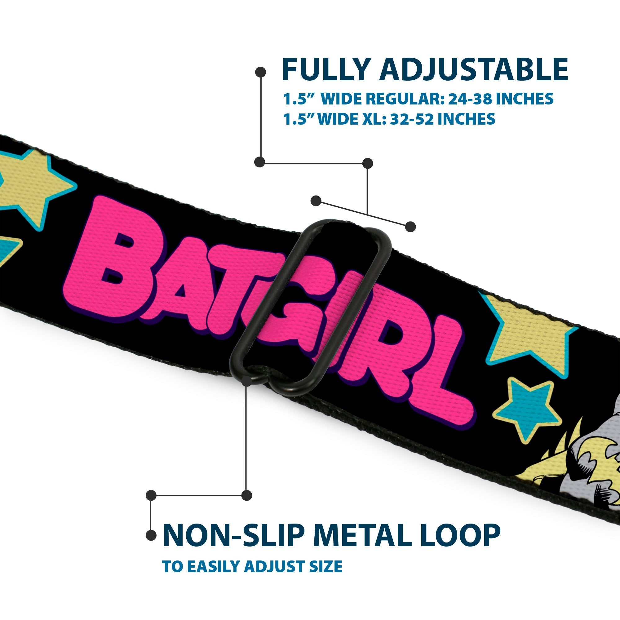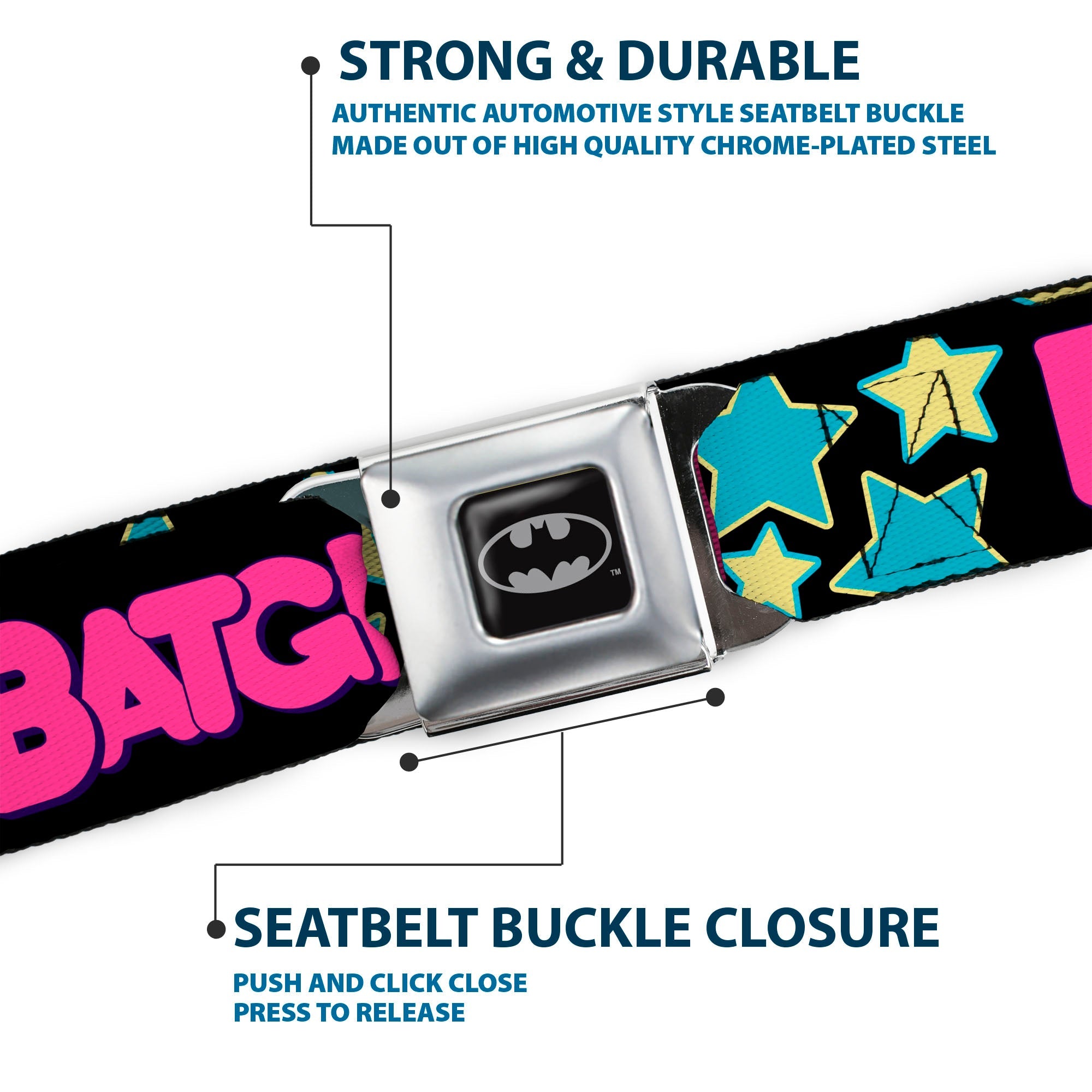 Buckle-Down's iconic Seatbelt Belt is a cool, smart, and exciting blend of fashion and function. Always a conversation starter, our Seatbelt Belt adjusts to perfectly fit your waist while showcasing your unique sense of style. Our Seatbelt Belts are made with authentic automotive style seatbelt buckles making them easy to open and close at the push of a button. Our adult-size Seatbelt Belts are 1.5 inches wide and our kid-sized Seatbelt belts are 1.0 inch wide. This product is Handcrafted in USA by Buckle-Down Inc. and officially licensed by DC Comics.