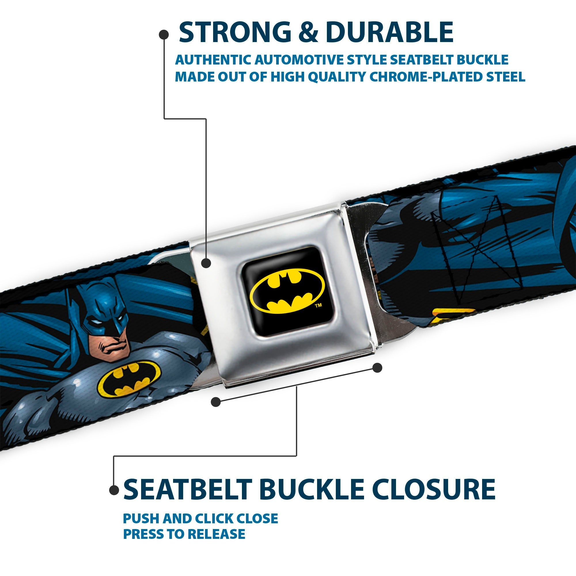 Buckle-Down's iconic Seatbelt Belt is a cool, smart, and exciting blend of fashion and function. Always a conversation starter, our Seatbelt Belt adjusts to perfectly fit your waist while showcasing your unique sense of style. Our Seatbelt Belts are made with authentic automotive style seatbelt buckles making them easy to open and close at the push of a button. Our adult-size Seatbelt Belts are 1.5 inches wide and our kid-sized Seatbelt belts are 1.0 inch wide. This product is Handcrafted in USA by Buckle-Down Inc. and officially licensed by DC Comics.