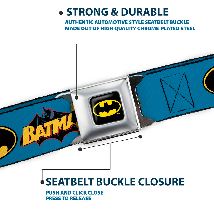 Batman Full Color Black Yellow Seatbelt Belt - Batman 2-Action Poses/Bat Signal Spotlight/Skyline Webbing