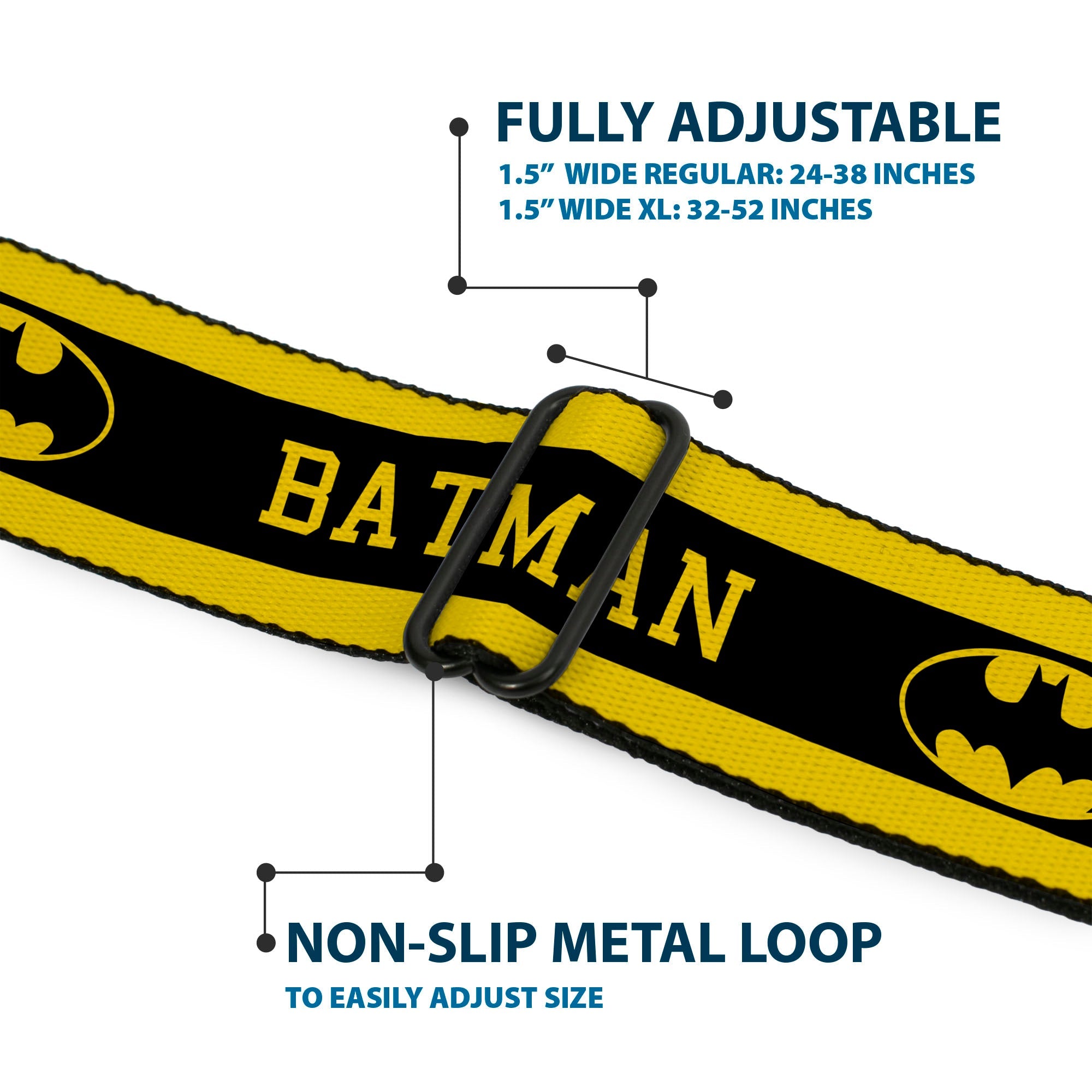 Buckle-Down's iconic Seatbelt Belt is a cool, smart, and exciting blend of fashion and function. Always a conversation starter, our Seatbelt Belt adjusts to perfectly fit your waist while showcasing your unique sense of style. Our Seatbelt Belts are made with authentic automotive style seatbelt buckles making them easy to open and close at the push of a button. Our adult-size Seatbelt Belts are 1.5 inches wide and our kid-sized Seatbelt belts are 1.0 inch wide. This product is Handcrafted in USA by Buckle-Down Inc. and officially licensed by DC Comics.
