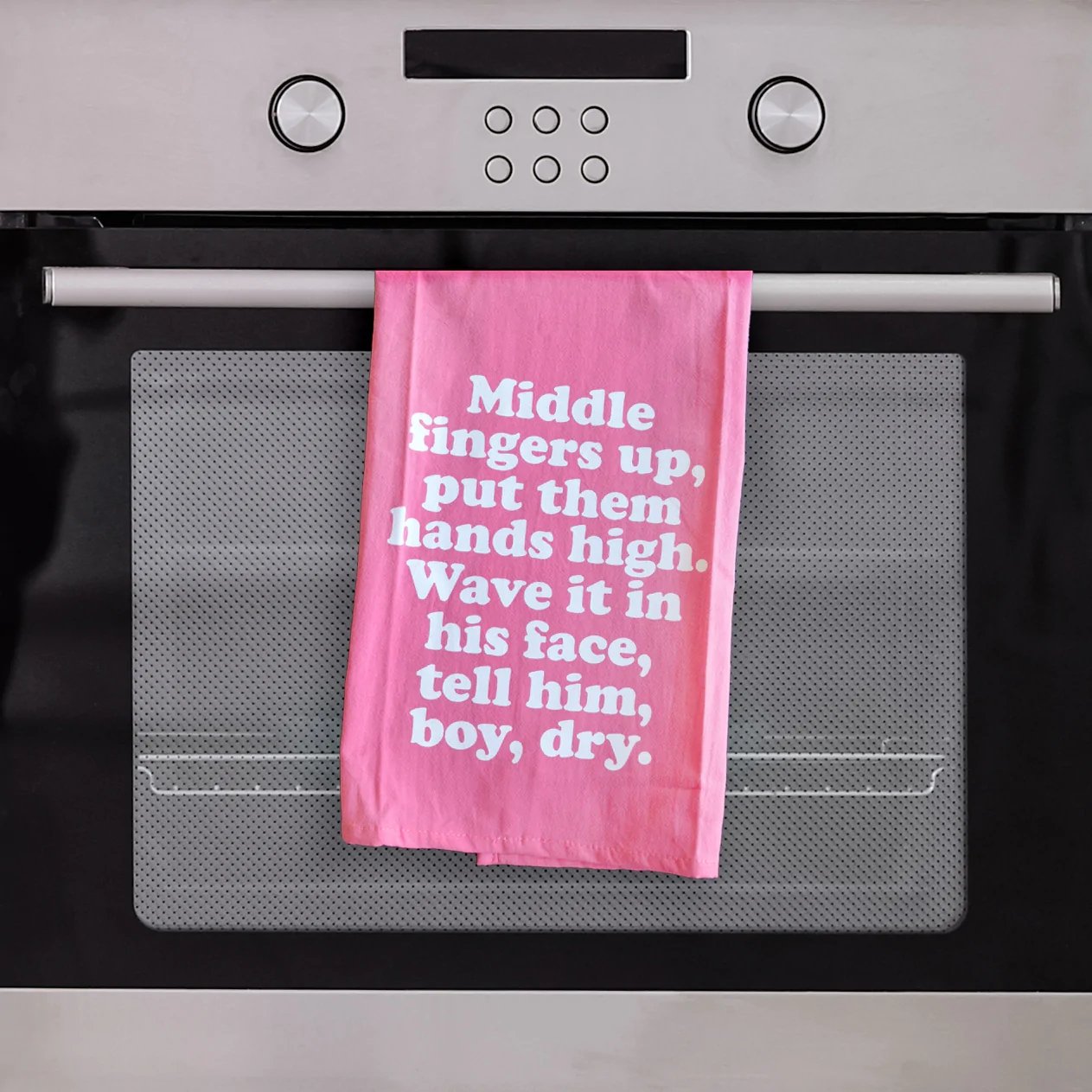 Dish towel reads: Middle fingers up, put them hands high. Wave it in his face, tell him, boy, dry.