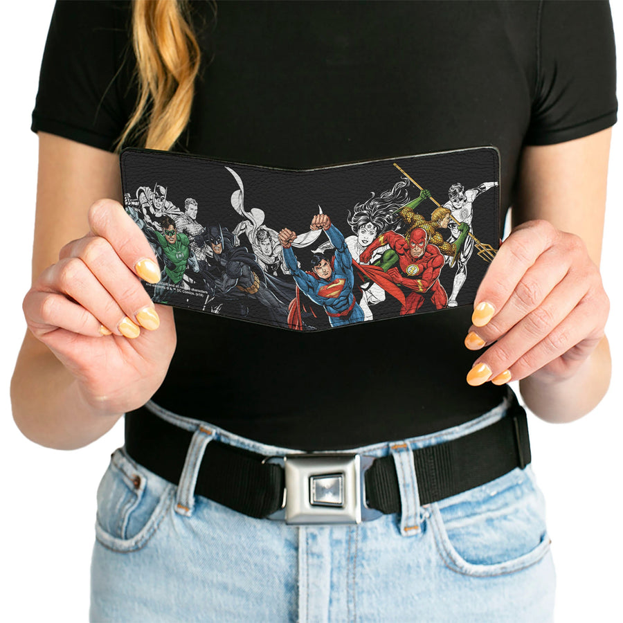 This awesome men's bi-fold wallet is made from premium vegan leather. It measures 4.0x3.5x0.5 Inches, and features the standard billfold, 5 card slots, and windowed ID holder. The logos are applied using advanced printing technologies, so the wallet will still look good after years of hard use. This product is made by Buckle-Down, Inc. and Officially Licensed by DC Comics.